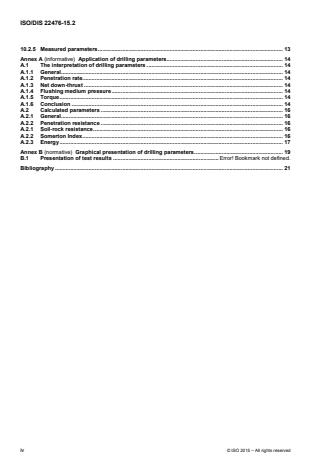Keywords: ISO 22476-15, measuring while drilling, MWD, geotechnical investigation, drilling parameters, field testing, drill rig, hydraulic drilling, drilling sensors, penetration rate, down-thrust, flushing medium.