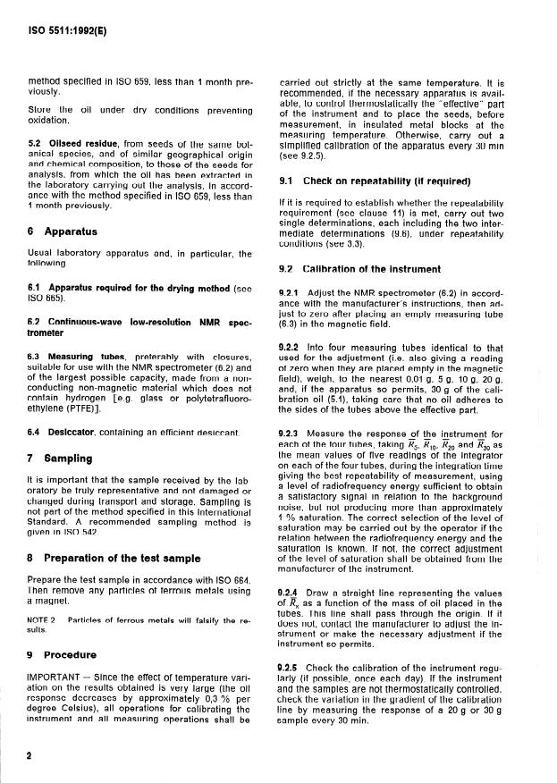 ISO 5511:1992 is a standard published by the International Organization for Standardization (ISO). Its full title is "Oilseeds — Determination of oil content — Method using continuous-wave low-resolution nuclear magnetic resonance spectrometry (Rapid method)". This standard covers: Under normal conditions of use, it does not apply to oilseeds which do not yield oil which is completely liquid at 20 °C (e.g. shea, palm, illipe, cocoa, etc.). The method has been successfully tested on the following oilseeds: rapeseed, soya, sunflower seed and groundnuts. The reference method for the determination of the oil content of oilseeds is specified in ISO 659.