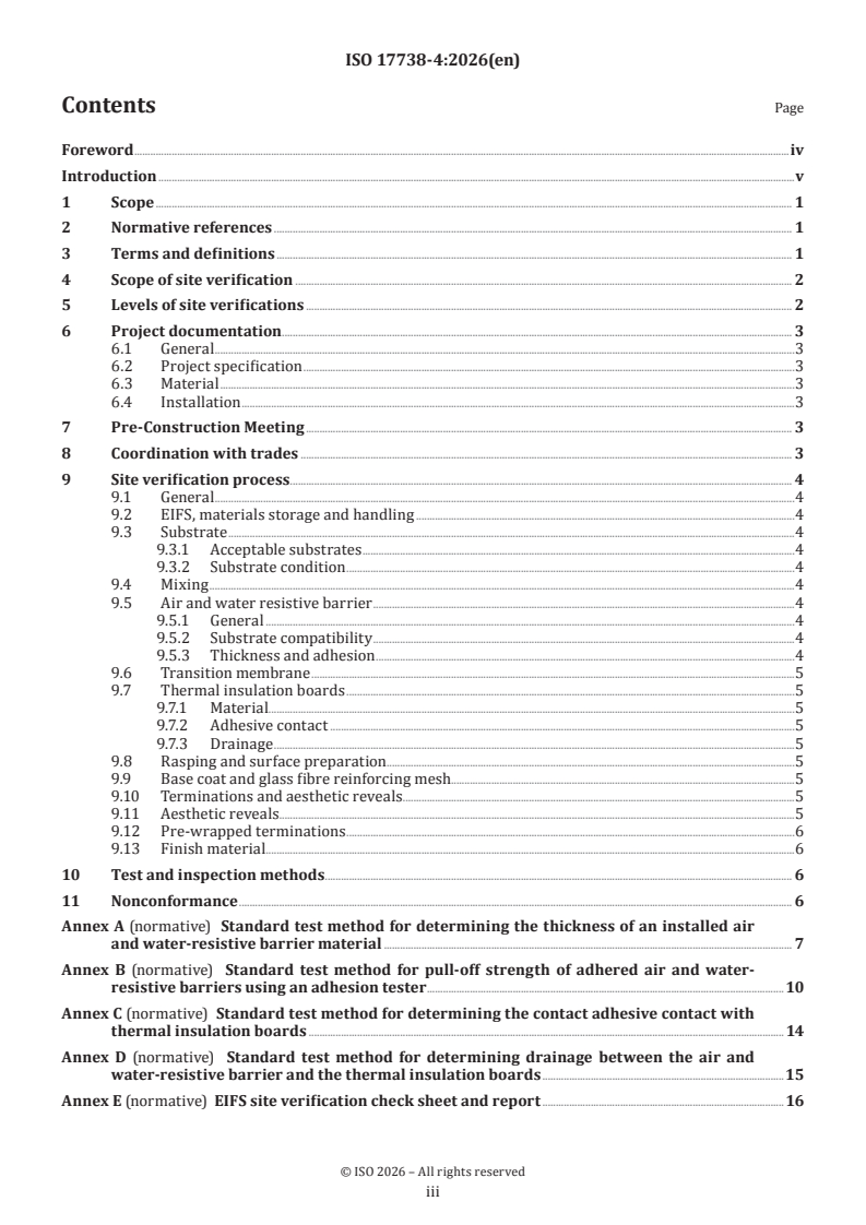 ISO 17738-4:2026 is a standard published by the International Organization for Standardization (ISO). Its full title is "Thermal insulation products — Exterior insulation and finish systems (EIFS) — Part 4: Site verification". This standard covers: This document provides the requirements for site verification that an installed system of EIFS, (exterior insulation and finish system), conforms with the requirements of ISO 17738-1, is installed in conformance with ISO 17738-2 and designed in conformance with ISO 17738-3. The document further covers EIFS installed on prefabricated panels being produced offsite and then installed on site. This document does not purport to address all the safety concerns, if any, associated with its use.