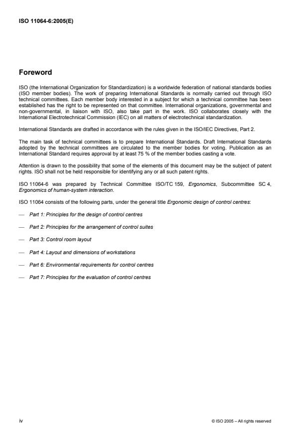 ISO 11064-6:2005 is a standard published by the International Organization for Standardization (ISO). Its full title is "Ergonomic design of control centres — Part 6: Environmental requirements for control centres". This standard covers: ISO 11064-6:2005 gives environmental requirements as well as recommendations for the ergonomic design, upgrading or refurbishment of control rooms and other functional areas within the control suite. The following aspects are covered: thermal environment (temperate regions); air quality; lighting environment; acoustic environment; vibration; aesthetics and interior design. It is applicable to all types of control centres, including those for the process industry, transport and dispatching systems and emergency services. Although it is primarily intended for non-mobile control centres, many of the principles are relevant to mobile centres such as those found on ships, locomotives and aircraft. It does not cover the influence of electromagnetic fields.