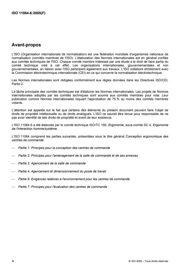L'ISO 11064-6:2005 définit des exigences relatives à l'environnement pour la conception ergonomique, la modernisation ou la rénovation des salles de commande et des autres zones fonctionnelles des annexes à la salle de commande. Les aspects suivants sont traités: l'environnement thermique (régions tempérées); la qualité de l'air; l'environnement lumineux; l'environnement acoustique; les vibrations; l'esthétique et la conception intérieure. Elle est applicable à tous les types de centres de commandes, y compris ceux destinés à l'industrie de transformation, aux transports et aux systèmes de répartition ainsi qu'aux services d'urgence. Bien qu'elle ait été conçue à l'origine pour les centres de commande non mobiles, bon nombre des principes s'appliquent également aux centres mobiles tels que ceux présents à bord des navires, des locomotives et des aéronefs. Elle ne traite pas de l'influence des champs électromagnétiques.