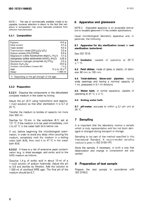 ISO 13721:1995 - Meat and meat products -- Enumeration of lactic acid bacteria -- Colony-count technique at 30 degrees C