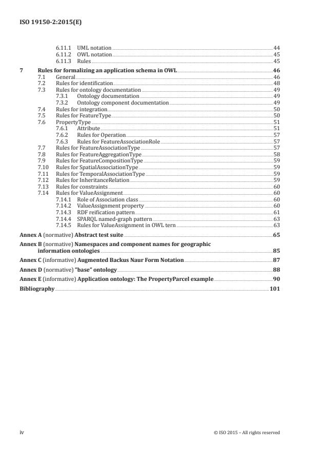 ISO 19150-2:2015 - "Geographic information - Ontology - Part 2" defines rules and guidelines for developing ontologies in the Web Ontology Language (OWL) to improve interoperability of geographic information on the Semantic Web. The standard prescribes how to convert UML static view elements used by ISO geographic information standards and how to express application schemas based on the General Feature Model (ISO 19109) into OWL. It adopts OWL/RDF as the ontology language but does not create domain semantics, define semantics operators, or specify service ontologies.