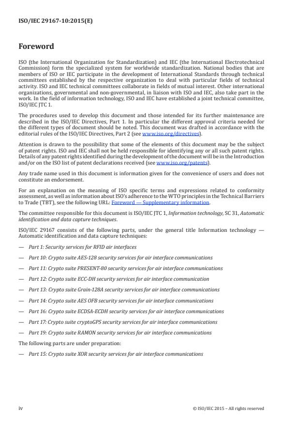 ISO/IEC 29167-10:2015 is a standard published by the International Organization for Standardization (ISO). Its full title is "Information technology — Automatic identification and data capture techniques — Part 10: Crypto suite AES-128 security services for air interface communications". This standard covers: ISO/IEC 29167-10:2015 defines the crypto suite for AES 128 for the ISO/IEC 18000 air interfaces standards for radio frequency identification (RFID) devices. Its purpose is to provide a common crypto suite for security for RFID devices that might be referred by ISO committees for air interface standards and application standards. This part of ISO/IEC 29167 specifies a crypto suite for AES 128 for air interface for RFID systems. The crypto suite is defined in alignment with existing air interfaces. This part of ISO/IEC 29167 defines various authentication methods and methods of use for the cipher. A Tag and an Interrogator can support one, a subset, or all of the specified options, clearly stating what is supported.
