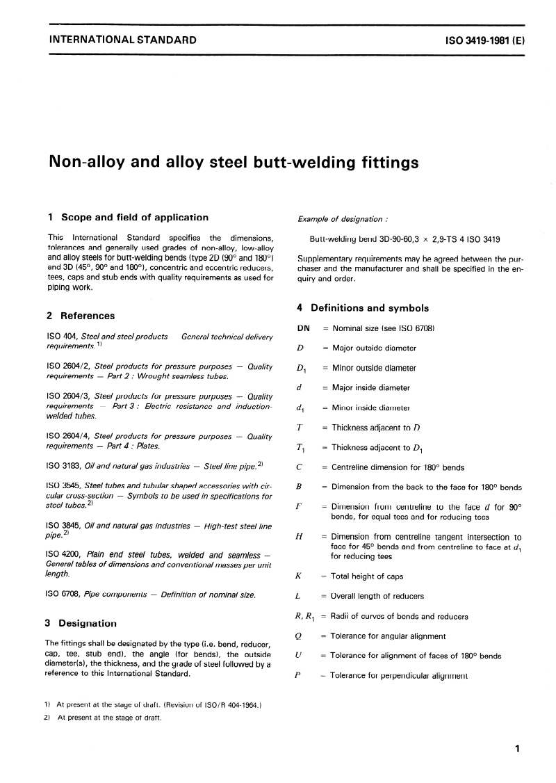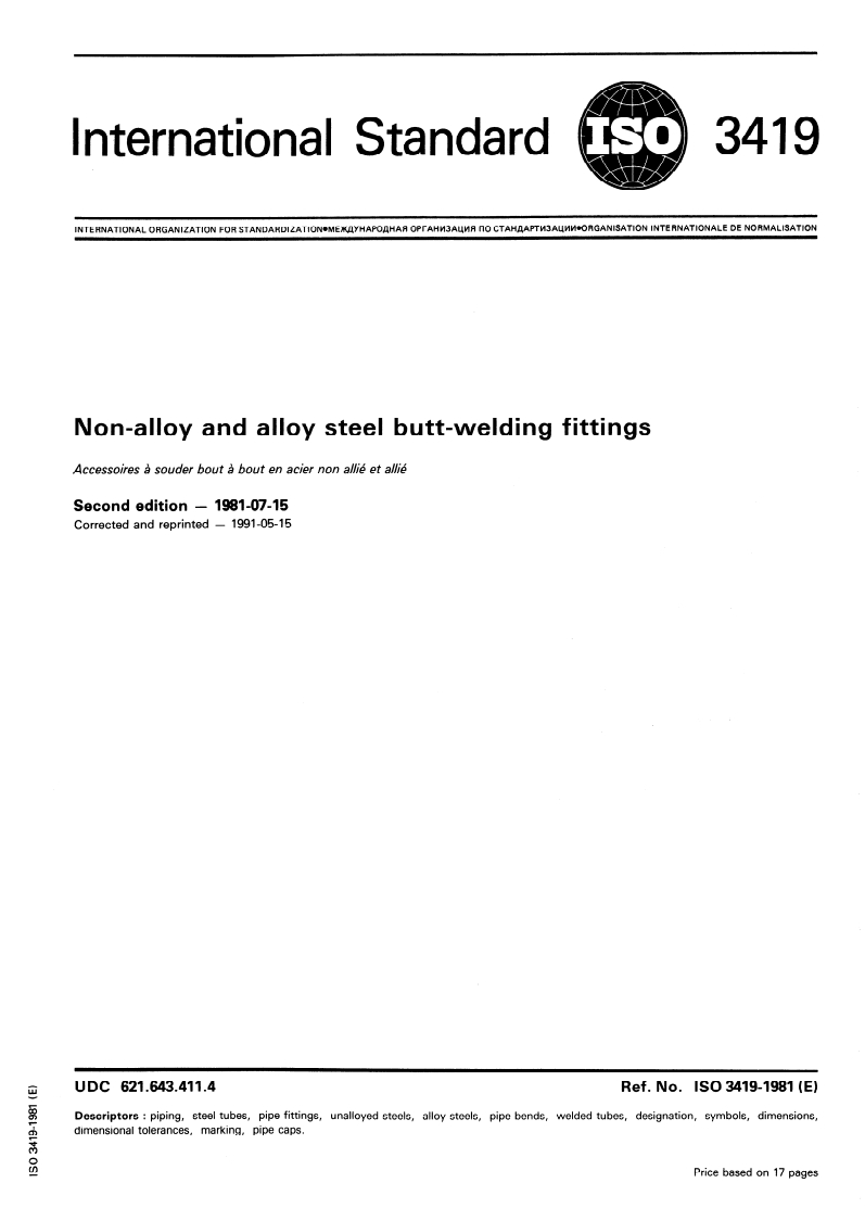 ISO 3419:1981 is a standard published by the International Organization for Standardization (ISO). Its full title is "Non-alloy and alloy steel butt-welding fittings". This standard covers: This second edition cancels and replaces the first edition (1975). Specifies the dimensions, tolerances and generally used grades of non-alloy, low alloy and alloy steels for bends /type 2D (90 and 180 ) and 3D (45 , 90 and 180 )/, concentric and eccentric reducers, tees, caps and ends with quality requirements as used for piping work.