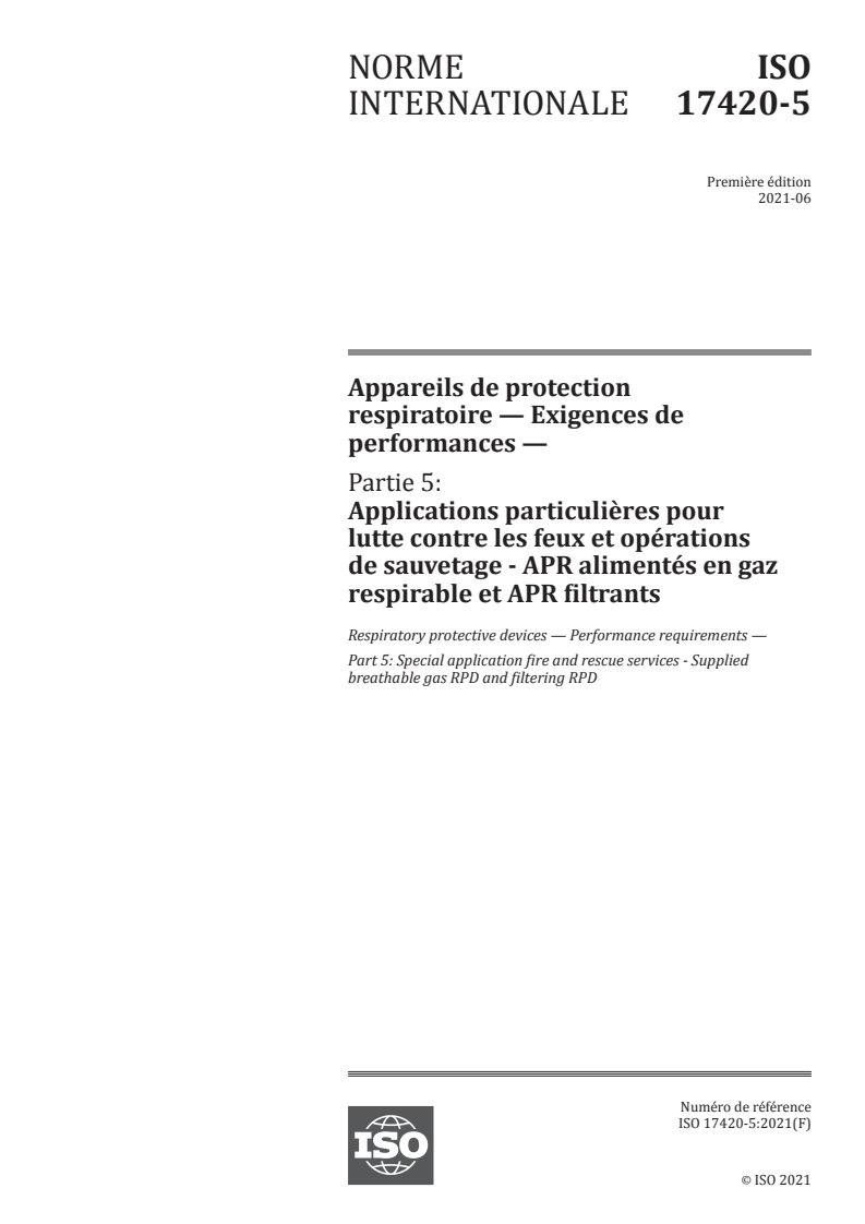 ISO 17420-5:2021 - Appareils de protection respiratoire — Exigences de performances — Partie 5: Applications particulières pour lutte contre les feux et opérations de sauvetage - APR alimentés en gaz respirable et APR filtrants Released:6/4/2021