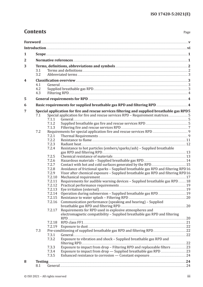 Keywords: ISO 17420-5, respiratory protective devices, supplied breathable gas RPD, filtering RPD, fire and rescue, performance requirements, RPD testing, thermal resistance, flame resistance, communication performance.