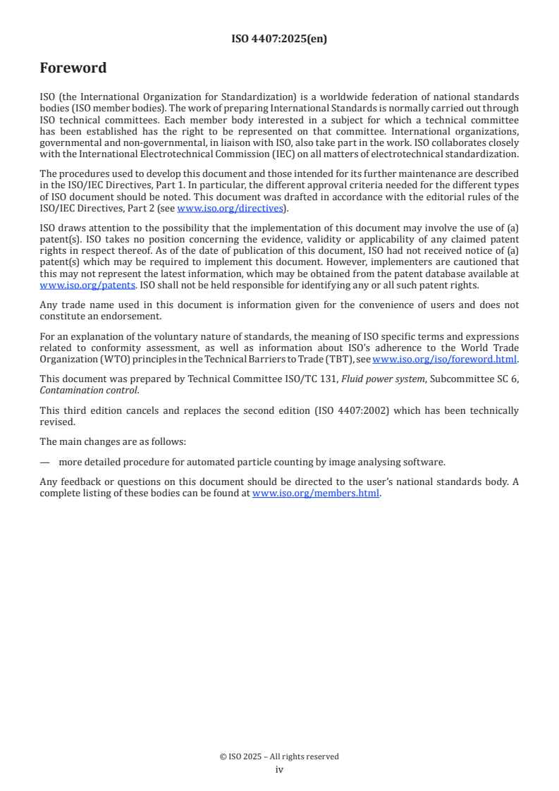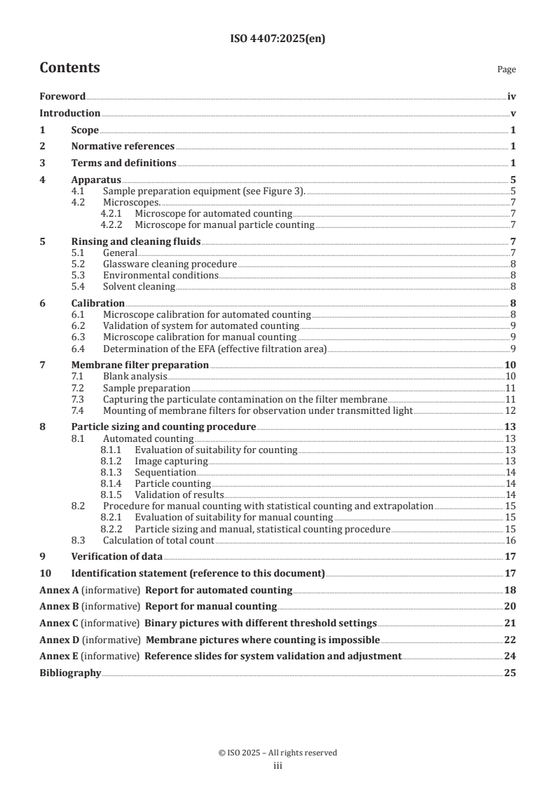 Keywords: ISO 4407:2025, hydraulic fluid power, fluid contamination, particulate contamination, optical microscope, automated counting, image analysis software, manual counting, filter membrane, effective filtration area (EFA).