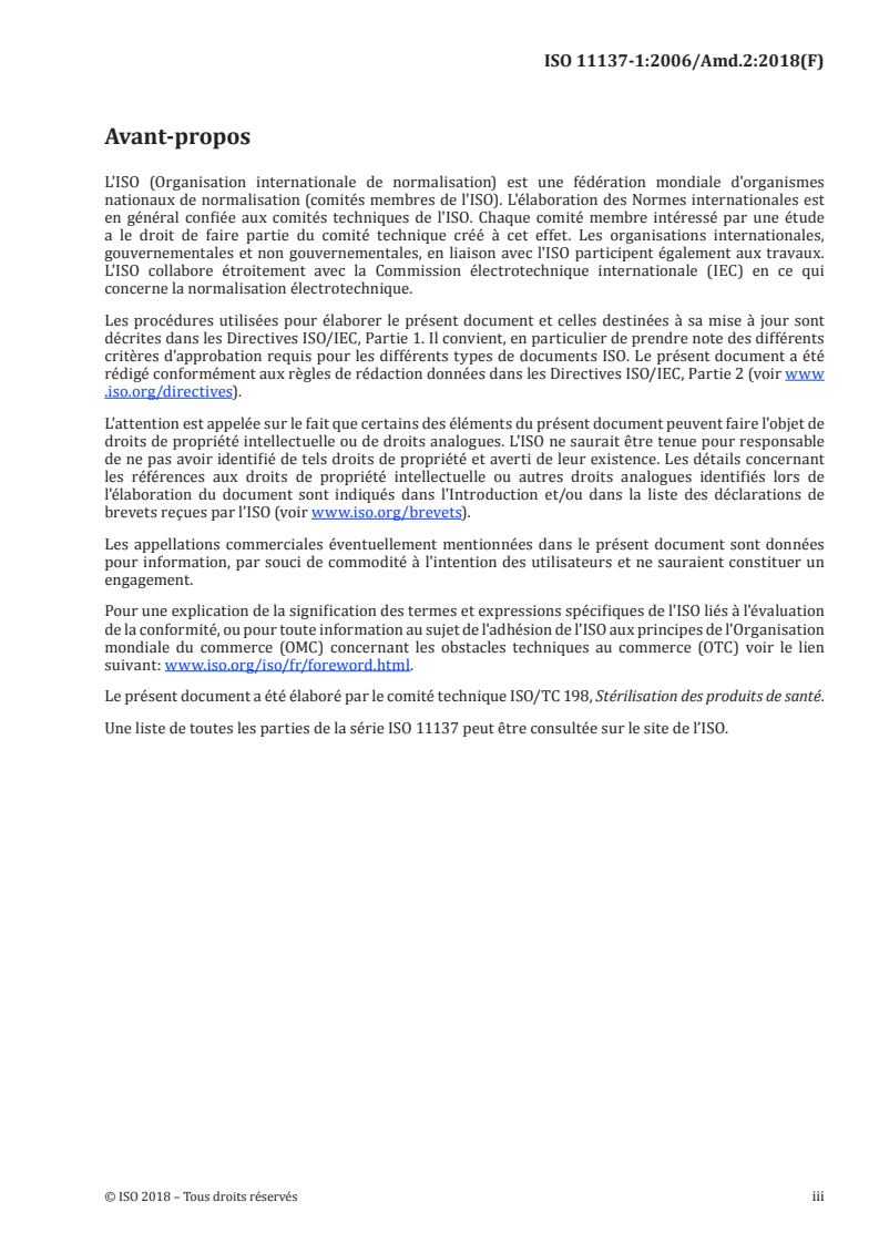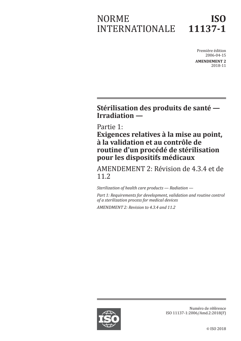 ISO 11137-1:2006/Amd 2:2018 - Stérilisation des produits de santé — Irradiation — Partie 1: Exigences relatives à la mise au point, à la validation et au contrôle de routine d'un procédé de stérilisation pour les dispositifs médicaux — Amendement 2: Révision de 4.3.4 et de 11.2 Released:11/8/2018