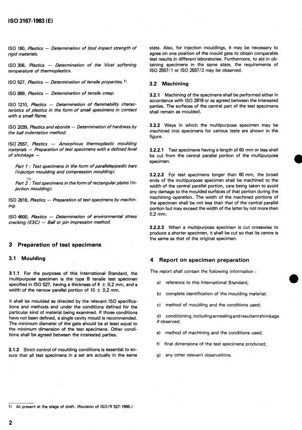 ISO 3167:1983 is a standard published by the International Organization for Standardization (ISO). Its full title is "Plastics — Preparation and use of multipurpose test specimens". This standard covers: Plastics — Preparation and use of multipurpose test specimens