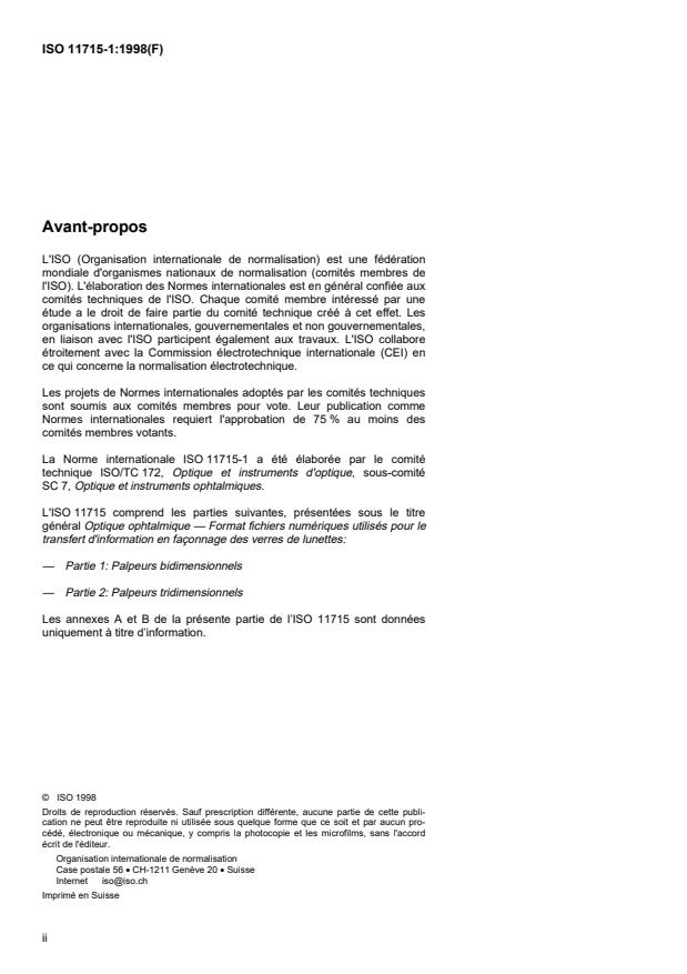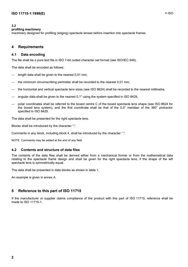 ISO 11715-1:1998 is a standard published by the International Organization for Standardization (ISO). Its full title is "Ophthalmic optics — Format of digital data files for data transfer for profiling of spectacle lenses — Part 1: Two-dimensional tracers". This standard covers: Ophthalmic optics — Format of digital data files for data transfer for profiling of spectacle lenses — Part 1: Two-dimensional tracers