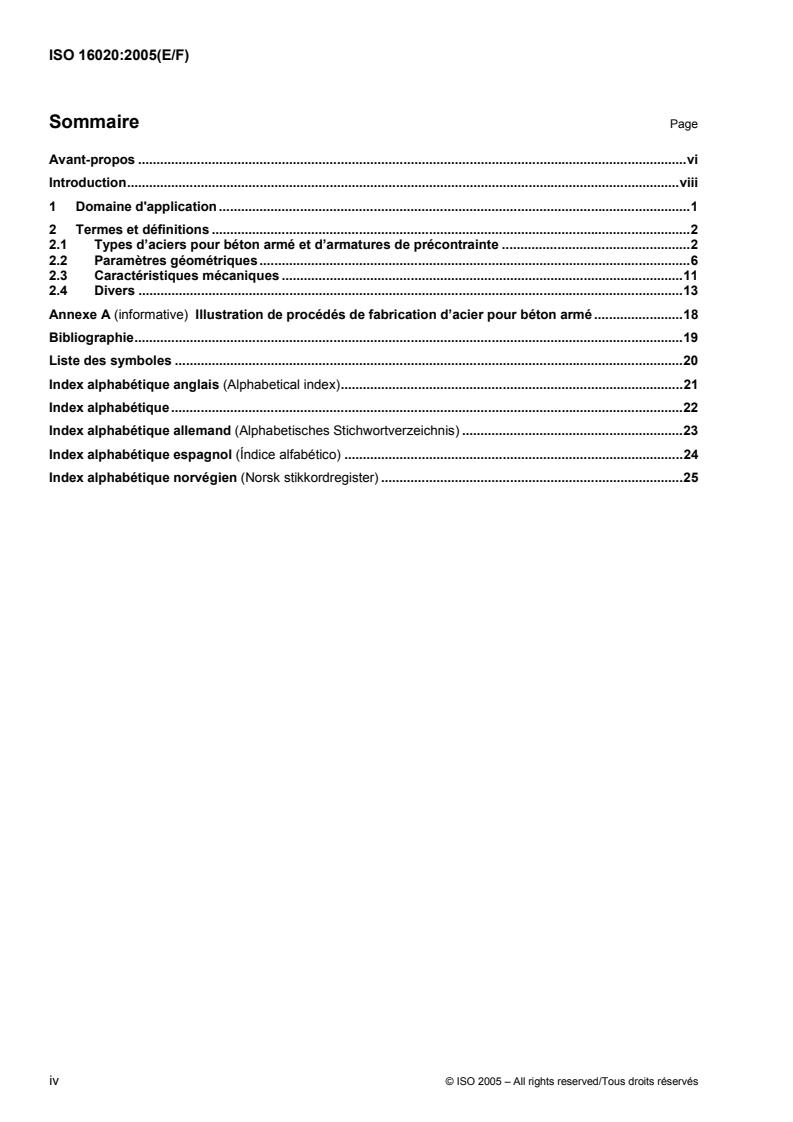 ISO 16020:2005 is an international vocabulary standard that defines terms and symbols used in the field of reinforcing and prestressing steel for concrete. Its purpose is to promote consistent, worldwide use of common terminology for steel used as reinforcement (rebar) and prestressing elements in concrete structures. The standard includes English and French official terms and gives equivalent German, Spanish and Norwegian terms (under national responsibility).