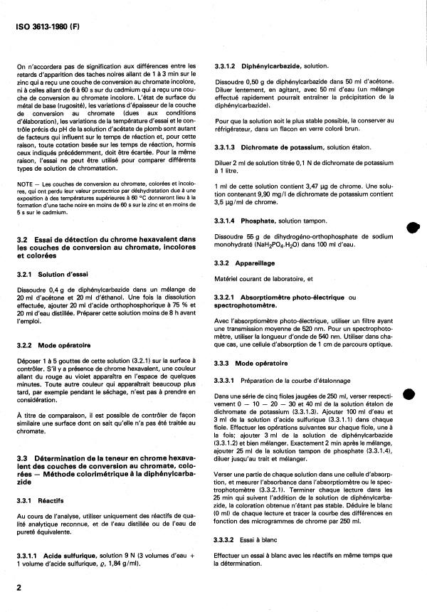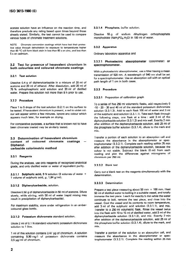 ISO 3613:1980 is a standard published by the International Organization for Standardization (ISO). Its full title is "Chromate conversion coatings on zinc and cadmium — Test methods". This standard covers: Chromate conversion coatings on zinc and cadmium — Test methods