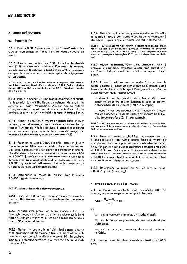 ISO 4496:1978 - Poudres métalliques -- Détermination de la teneur en insolubles dans les acides pour les poudres de fer, de cuivre, d'étain et de bronze