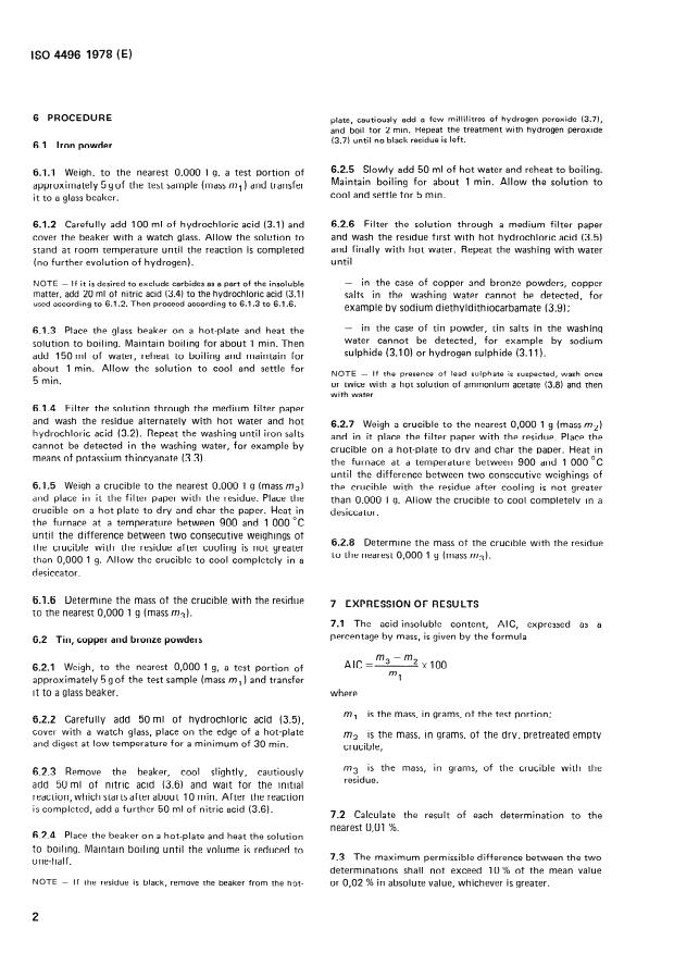 ISO 4496:1978 is a standard published by the International Organization for Standardization (ISO). Its full title is "Metallic powders — Determination of acid insoluble content in iron, copper, tin and bronze powders". This standard covers: The insoluble matter is generally considered to be acid-insoluble silica and silicates, carbides, alumina, and clays. The methods are applicable to lubricant-free powders. ISO 4496 specifies apparatus and reagents, sampling, procedure, expression of results and test report.