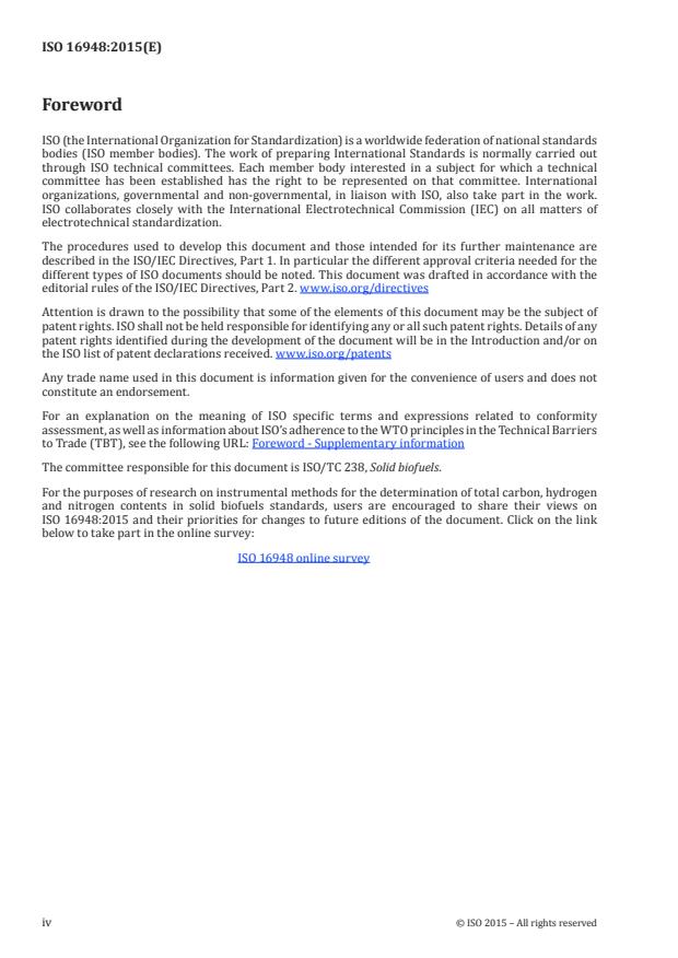 ISO 16948:2015 is a standard published by the International Organization for Standardization (ISO). Its full title is "Solid biofuels - Determination of total content of carbon, hydrogen and nitrogen". This standard covers: ISO 16948:2015 describes a method for the determination of total carbon, hydrogen and nitrogen contents in solid biofuels.
