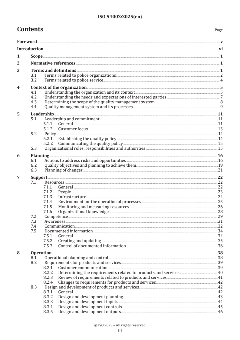 The standard adapts ISO 9001:2015 requirements to police organizations and covers core QMS elements, including: