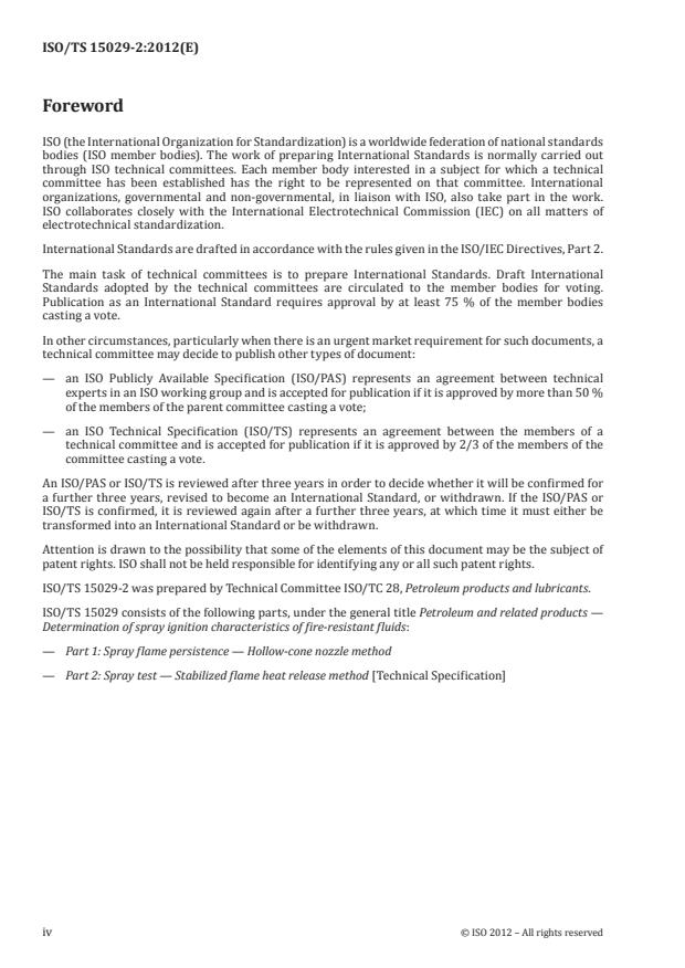 ISO/TS 15029-2:2012 is a technical specification published by the International Organization for Standardization (ISO). Its full title is "Petroleum and related products — Determination of spray ignition characteristics of fire-resistant fluids — Part 2: Spray test — Stabilized flame heat release method". This standard covers: ISO/TS 15029-2:2012 specifies a method by which the fire hazards of pressurized sprays of fire-resistant fluids can be compared. Two sizes of propane flame are used to ignite and stabilize combustion of an air-atomised release of fluid, and measurements related to the rate of heat release, length of flame and density of smoke are taken to give quantitative information on the fire behaviour of the fluid.