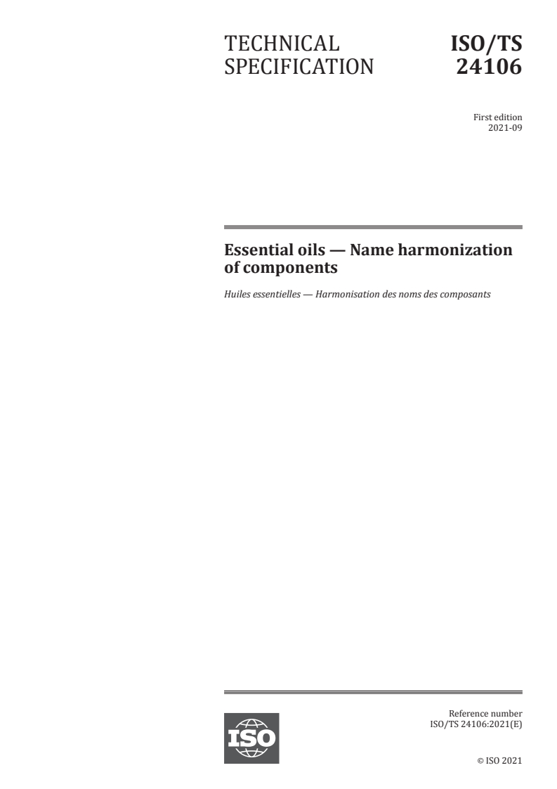 ISO/TS 24106:2021 - Essential oils — Name harmonization of components Released:9/9/2021