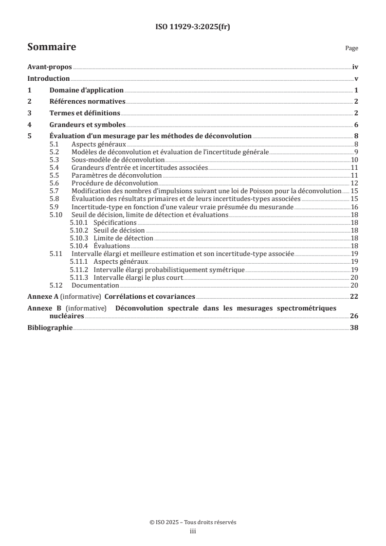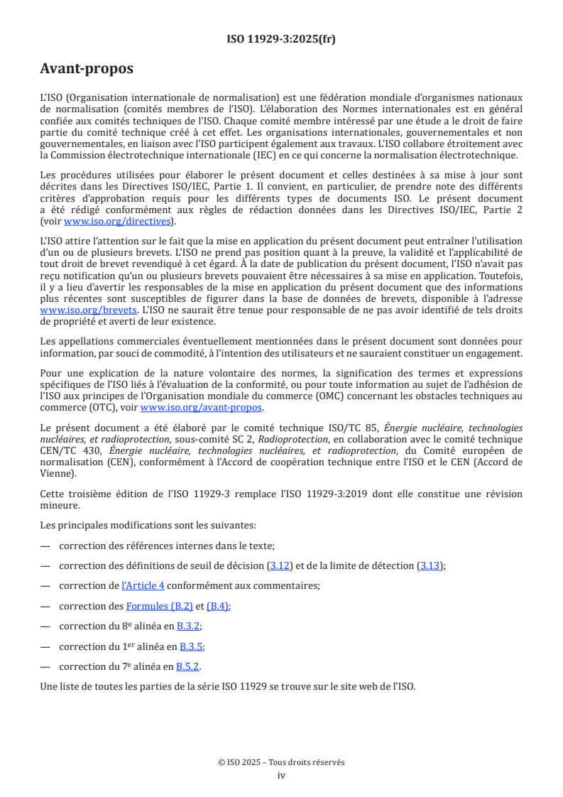 La série ISO 11929 spécifie une procédure applicable, dans le domaine de la métrologie des rayonnements ionisants, pour le calcul du «seuil de décision», de la «limite de détection» et des «limites de l’intervalle élargi» pour un mesurande de rayonnement ionisant non négatif, lorsque des mesurages par comptage sont effectués avec une présélection du temps ou du nombre d’impulsions. Le mesurande résulte d’un taux de comptage brut et d’un taux de comptage du bruit de fond ainsi que de grandeurs supplémentaires reposant sur un modèle d’évaluation. En particulier, le mesurande peut être le taux de comptage net défini comme la différence du taux de comptage brut et du taux de comptage du bruit de fond, ou l’activité nette d’un échantillon. Il peut également être influencé par l’étalonnage du système de mesure, par le traitement de l’échantillon et par d’autres facteurs. L’ISO 11929 a été scindée en quatre parties couvrant les applications élémentaires dans l’ISO 11929-1, les applications avancées reposant sur le Guide ISO/IEC 98-3:2008/Suppl 1:2008 dans l’ISO 11929-2, les applications aux méthodes de déconvolution dans le présent document, et les recommandations d’application dans l’ISO 11929-4. L’ISO 11929-1 couvre les applications de base des mesurages par comptage souvent utilisées dans le domaine de la métrologie des rayonnements ionisants. Elle se limite aux applications pour lesquelles il est possible d’évaluer les incertitudes sur la base du Guide ISO/IEC 98-3 (JCGM 2008). L’ISO 11929-1:2025, Annexe A, traite du cas particulier des mesurages répétés par comptage avec des influences aléatoires, alors que l’ISO 11929-1:2025, Annexe B, couvre les mesurages avec des ictomètres analogiques linéaires. Le présent document traite de l’évaluation des mesurages en utilisant des méthodes de déconvolution ainsi que de l’évaluation des mesurages multicanaux spectrométriques par comptage en cas d’évaluation par des méthodes de déconvolution, en particulier pour les mesurages spectrométriques alpha et gamma. Elle fournit en outre des conseils pour le traitement avec des corrélations et des covariances. L’ISO 11929-4 fournit des recommandations pour l’application de la série ISO 11929, résume les grandes lignes de la procédure générale et présente ensuite un large éventail d’exemples numériques. L’ISO 11929 s’applique également de manière analogue à d’autres mesurages de tout type, notamment si un modèle d’évaluation similaire est concerné. D’autres exemples pratiques sont, par exemple, disponibles dans l’ISO 18589,[ REF Reference_ref_14 \r \h 7 08D0C9EA79F9BACE118C8200AA004BA90B0200000008000000110000005200650066006500720065006E00630065005F007200650066005F00310034000000 ] l’ISO 9696,[ REF Reference_ref_9 \r \h 2 08D0C9EA79F9BACE118C8200AA004BA90B0200000008000000100000005200650066006500720065006E00630065005F007200650066005F0039000000 ] l’ISO 9697,[ REF Reference_ref_10 \r \h 3 08D0C9EA79F9BACE118C8200AA004BA90B0200000008000000110000005200650066006500720065006E00630065005F007200650066005F00310030000000 ] l’ISO 9698,[ REF Reference_ref_11 \r \h 4 08D0C9EA79F9BACE118C8200AA004BA90B0200000008000000110000005200650066006500720065006E00630065005F007200650066005F00310031000000 ] l’ISO 10703,[ REF Reference_ref_12 \r \h 5 08D0C9EA79F9BACE118C8200AA004BA90B0200000008000000110000005200650066006500720065006E00630065005F007200650066005F00310032000000 ] l’ISO 7503,[ REF Reference_ref_8 \r \h 1 08D0C9EA79F9BACE118C8200AA004BA90B0200000008000000100000005200650066006500720065006E00630065005F007200650066005F0038000000 ] l’ISO 28218[ REF Reference_ref_15 \r \h 8 08D0C9EA79F9BACE118C8200AA004BA90B0200000008000000110000005200650066006500720065006E00630065005F007200650066005F00310035000000 ] et l’ISO 11665[ REF Reference_ref_13 \r \h 6 08D0C9EA79F9BACE118C8200AA004BA90B0200000008000000110000005200650066006500720065006E00630065005F007200650066005F00310033000000 ]. NOTE Un logiciel, baptisé UncertRadio, est disponible pour les calculs conformément aux ISO 119