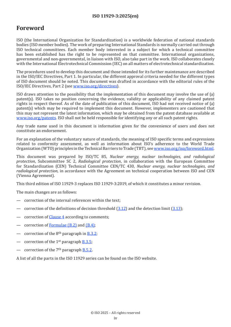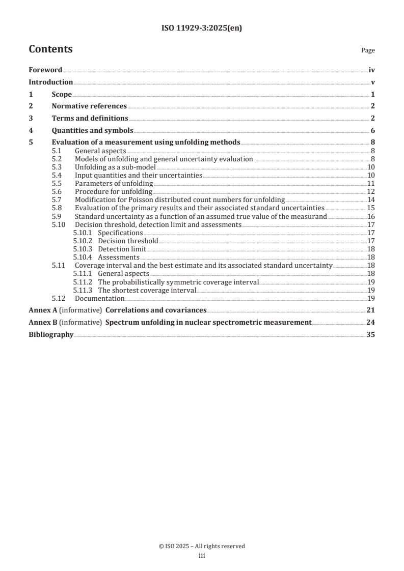 ISO 11929-3:2025 is a standard published by the International Organization for Standardization (ISO). Its full title is "Determination of the characteristic limits (decision threshold, detection limit and limits of the coverage interval) for measurements of ionizing radiation - Fundamentals and application - Part 3: Applications to unfolding methods". This standard covers: The ISO 11929 series specifies a procedure, in the field of ionizing radiation metrology, for the calculation of the “decision threshold”, the “detection limit” and the “limits of the coverage interval” for a non-negative ionizing radiation measurand when counting measurements with preselection of time or counts are carried out. The measurand results from a gross count rate and a background count rate as well as from further quantities on the basis of a model of the evaluation. In particular, the measurand can be the net count rate as the difference of the gross count rate and the background count rate, or the net activity of a sample. It can also be influenced by calibration of the measuring system, by sample treatment and by other factors. ISO 11929 has been divided into four parts covering elementary applications in ISO 11929-1, advanced applications on the basis of the ISO/IEC Guide 98-3:2008/Suppl 1:2008 in ISO 11929-2, applications to unfolding methods in this document, and guidance to the application in ISO 11929-4. ISO 11929-1 covers basic applications of counting measurements frequently used in the field of ionizing radiation metrology. It is restricted to applications for which the uncertainties can be evaluated on the basis of the ISO/IEC Guide 98-3 (JCGM 2008). In ISO 11929-1:2025, Annex A, the special case of repeated counting measurements with random influences is covered, while measurements with linear analogous ratemeters, are covered in ISO 11929-1:2025, Annex B. This document deals with the evaluation of measurements using unfolding methods and counting spectrometric multi-channel measurements if evaluated by unfolding methods, in particular, for alpha- and gamma‑spectrometric measurements. Further, it provides some advice on how to deal with correlations and covariances. ISO 11929-4 gives guidance to the application of the ISO 11929 series, summarizes shortly the general procedure and then presents a wide range of numerical examples. ISO 11929 Standard also applies analogously to other measurements of any kind especially if a similar model of the evaluation is involved. Further practical examples can be found, for example, in ISO 18589[ REF Reference_ref_14 \r \h 7 08D0C9EA79F9BACE118C8200AA004BA90B0200000008000000110000005200650066006500720065006E00630065005F007200650066005F00310034000000 ], ISO 9696[ REF Reference_ref_9 \r \h 2 08D0C9EA79F9BACE118C8200AA004BA90B0200000008000000100000005200650066006500720065006E00630065005F007200650066005F0039000000 ], ISO 9697[ REF Reference_ref_10 \r \h 3 08D0C9EA79F9BACE118C8200AA004BA90B0200000008000000110000005200650066006500720065006E00630065005F007200650066005F00310030000000 ], ISO 9698[ REF Reference_ref_11 \r \h 4 08D0C9EA79F9BACE118C8200AA004BA90B0200000008000000110000005200650066006500720065006E00630065005F007200650066005F00310031000000 ], ISO 10703[ REF Reference_ref_12 \r \h 5 08D0C9EA79F9BACE118C8200AA004BA90B0200000008000000110000005200650066006500720065006E00630065005F007200650066005F00310032000000 ], ISO 7503[ REF Reference_ref_8 \r \h 1 08D0C9EA79F9BACE118C8200AA004BA90B0200000008000000100000005200650066006500720065006E00630065005F007200650066005F0038000000 ], ISO 28218[ REF Reference_ref_15 \r \h 8 08D0C9EA79F9BACE118C8200AA004BA90B0200000008000000110000005200650066006500720065006E00630065005F007200650066005F00310035000000 ], and ISO 11665[ REF Reference_ref_13 \r \h 6 08D0C9EA79F9BACE118C8200AA004BA90B0200000008000000110000005200650066006500720065006E00630065005F007200650066005F00310033000000 ]. NOTE A code system, named UncertRadio, is available for calculations according to ISO 11929- 1 to ISO 11929-3. UncertRadio[ REF Reference_ref_42 \r \h 35 08D0C9EA79F9BACE118C8200AA004BA90B0200000008000000110000005200650066006500720065006E00630065005F007200650066005F00340032000000 ][ REF Reference_ref_43 \r \h 36 08D0C9EA79F9BACE118C8200AA004BA90B0200000008000000110000005200650066006500720065006E00630065005F007200650066005F00340033000000 ] can be downloaded