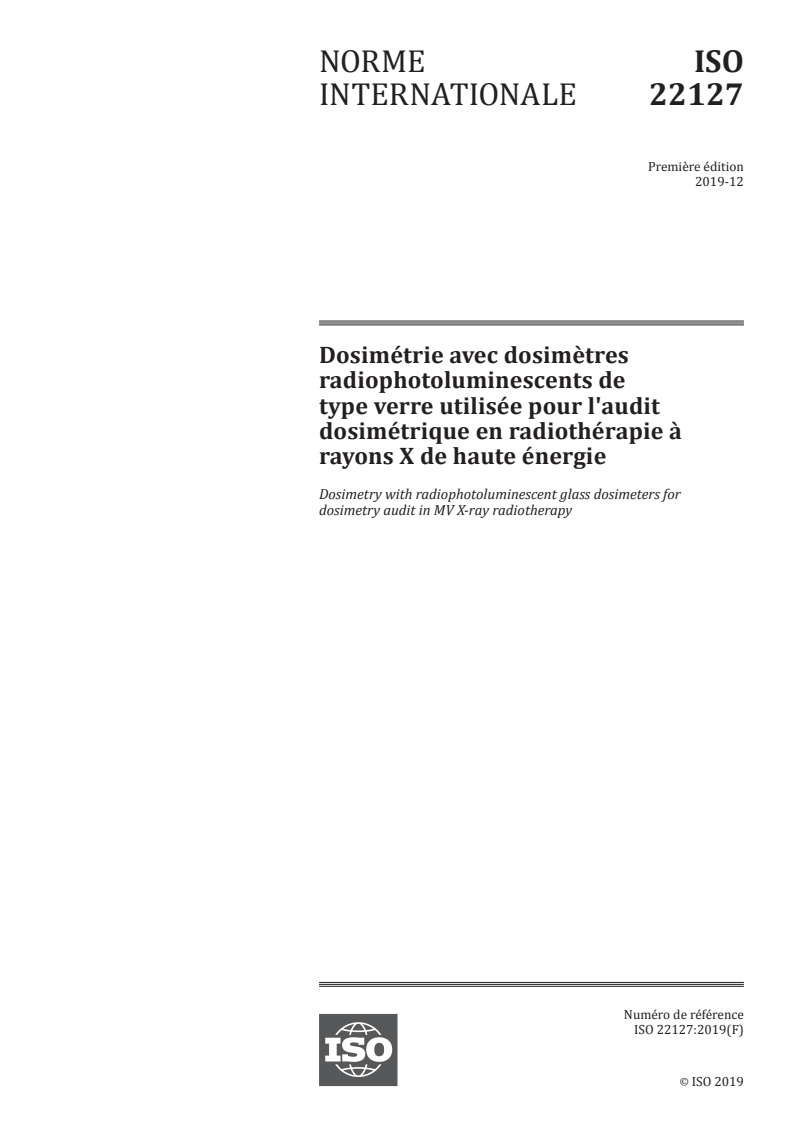 ISO 22127:2019 - Dosimétrie avec dosimetres radiophotoluminescents de type verre utilisée pour l'audit dosimétrique en radiothérapie a rayons X de haute énergie