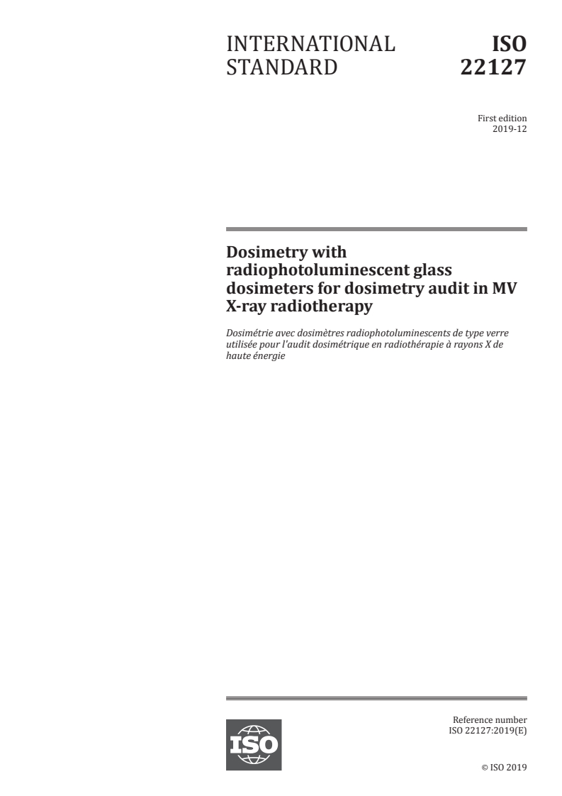 ISO 22127:2019 - Dosimetry with radiophotoluminescent glass dosimeters for dosimetry audit in MV X-ray radiotherapy Released:12/10/2019