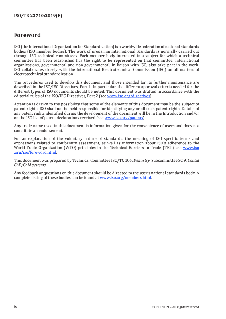 ISO/TR 22710:2019, titled Dentistry - Vocabulary of process chain from dental CT to CAD/CAM for implant prosthetic restorations - Backward planning in the digital process chain, is a specialized technical report developed by ISO's Technical Committee ISO/TC 106, Subcommittee SC 9. This document standardizes the terminology related to the digital workflow from initial implant imaging through dental computed tomography (dental CT) to computer-aided design and manufacturing (CAD/CAM) of implant prosthetic restorations.