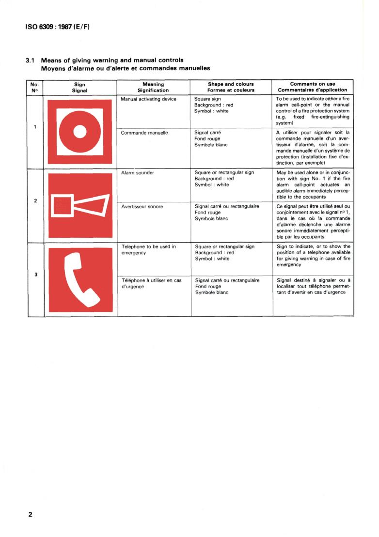 ISO 6309:1987 is a standard published by the International Organization for Standardization (ISO). Its full title is "Fire protection — Safety signs". This standard covers: Applicable to all situations in which it is necessary or desirable to indicate publicity the location and/or the nature of means of giving warning of fire and manual controls; means of escape from fire; means of fire-fighting; means of preventing fire spreading; areas or materials of special fire risk. Does not apply to graphical symbols used on plans or maps.