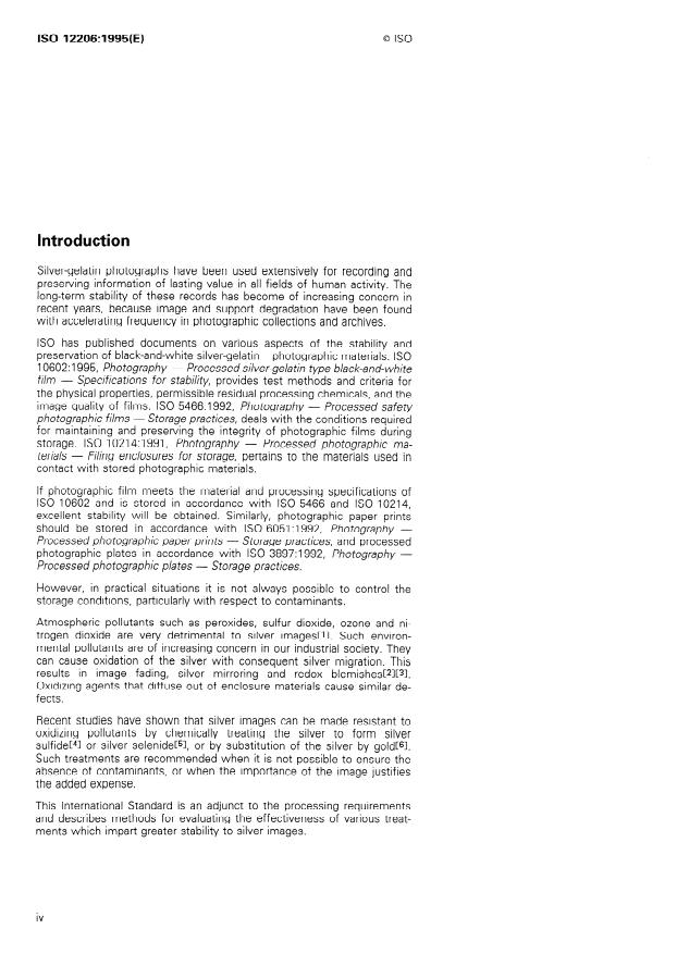 ISO 12206:1995 is a standard published by the International Organization for Standardization (ISO). Its full title is "Photography — Methods for the evaluation of the effectiveness of chemical conversion of silver images against oxidation". This standard covers: Photography — Methods for the evaluation of the effectiveness of chemical conversion of silver images against oxidation