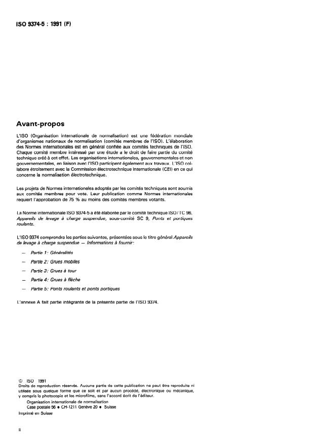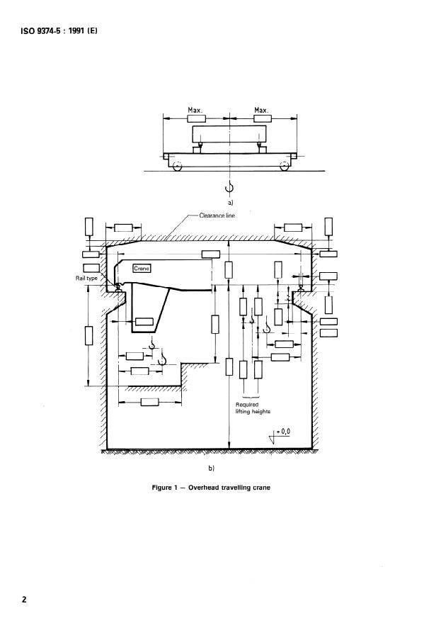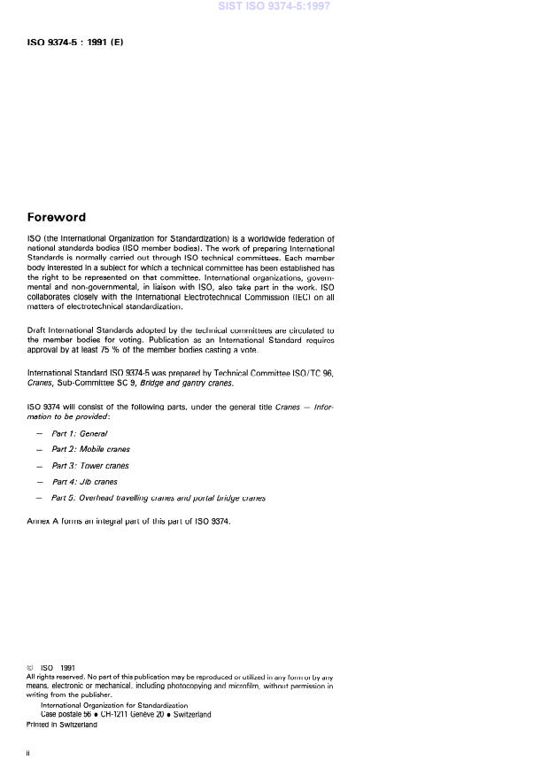 ISO 9374-5:1991 is a standard published by the International Organization for Standardization (ISO). Its full title is "Cranes — Information to be provided — Part 5: Overhead travelling cranes and portal bridge cranes". This standard covers: Specifies information to be provided by: a purchaser in enquiring about or ordering a crane, a manufacturer in tendering for or supplying a crane. Annex A forms an integral part of this standard.