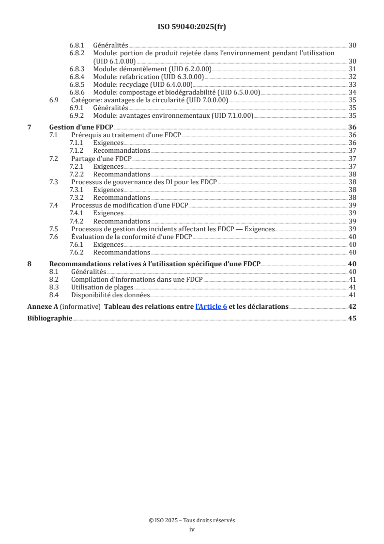 Le présent document établit une méthodologie générale permettant un échange d’informations qui favorise l’interopérabilité des informations liées à l’économie circulaire, grâce à l’utilisation d’une fiche de données de circularité des produits (FDCP). Le présent document précise les exigences relatives à l’élaboration d’une FDCP par un organisme, de quelque type, taille et nature que ce soit, lors de l’acquisition ou de la fourniture de produits, afin de permettre l’échange d’informations produits liées à l’économie circulaire, sans divulguer d’informations commerciales confidentielles. Le présent document précise également les exigences relatives au format de déclaration à utiliser lors de la création d’un modèle de FDCP, en fonction des déclarations de circularité choisies et utilisées conformément aux caractéristiques du produit concerné. En outre, le présent document fournit des recommandations sur la gestion et le partage d’une FDCP, ainsi que sur la création d’un modèle de FDCP.