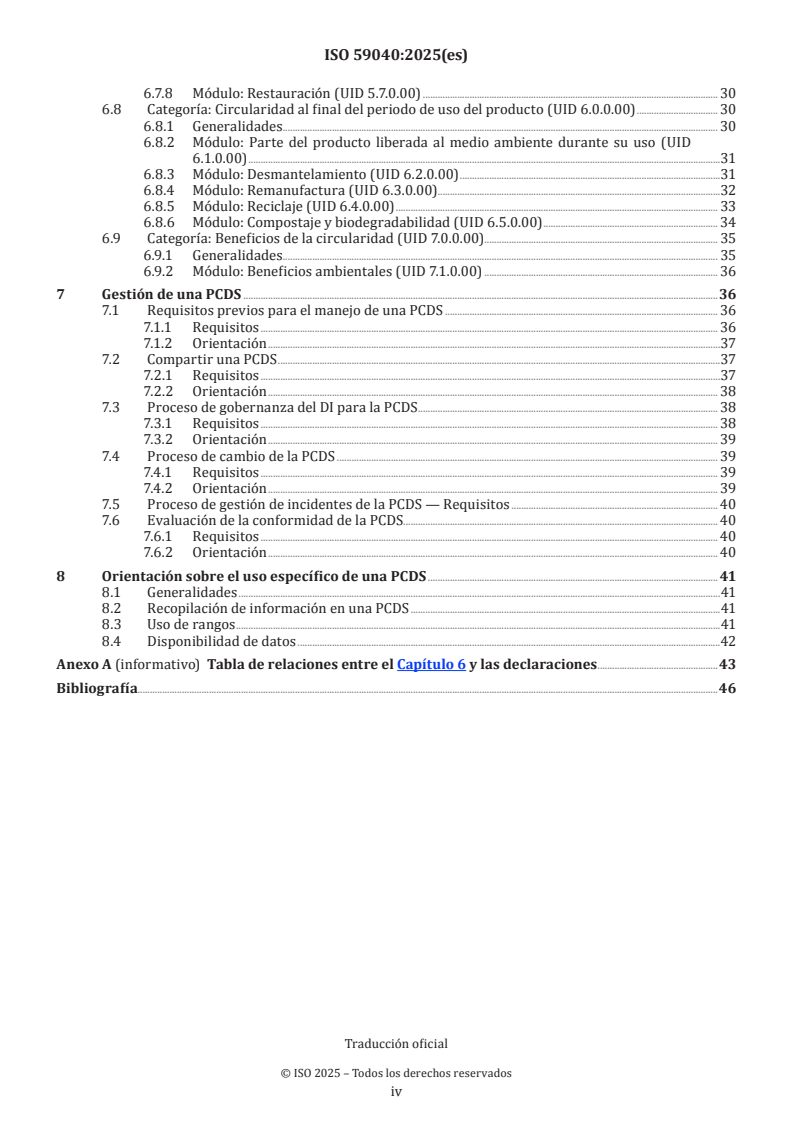 ISO 59040:2025 is a standard published by the International Organization for Standardization (ISO). Its full title is "Circular economy — Product circularity data sheet". This standard covers: This document establishes a general methodology for information exchange supporting the interoperability of circular economy related information, based on the use of a product circularity data sheet (PCDS). This document specifies requirements for completing a PCDS by an organization, regardless of its type, size and nature, when acquiring or supplying products in order to permit the exchange of circular economy related information about those products, without disclosing confidential business information. This document also specifies requirements for the reporting format to be used when creating a PCDS template, based on the selection and use of various product circularity statements, according to the characteristics of the product. In addition, this document gives guidance on managing and sharing a PCDS, as well as guidance on creating a PCDS template.