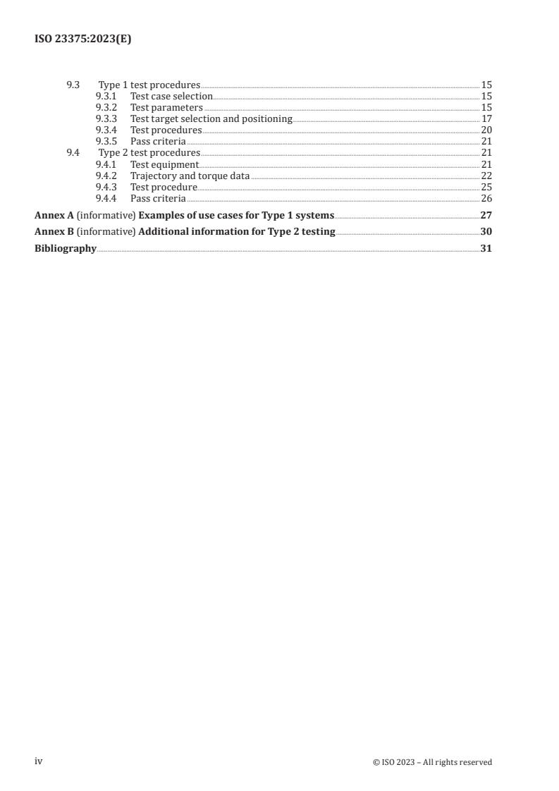 ISO 23375:2023 organizes requirements and test methods across system design and verification elements, including: