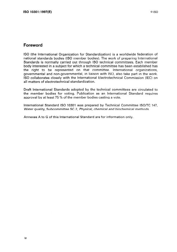 ISO 10301:1997 is a standard published by the International Organization for Standardization (ISO). Its full title is "Water quality — Determination of highly volatile halogenated hydrocarbons — Gas-chromatographic methods". This standard covers: Water quality — Determination of highly volatile halogenated hydrocarbons — Gas-chromatographic methods