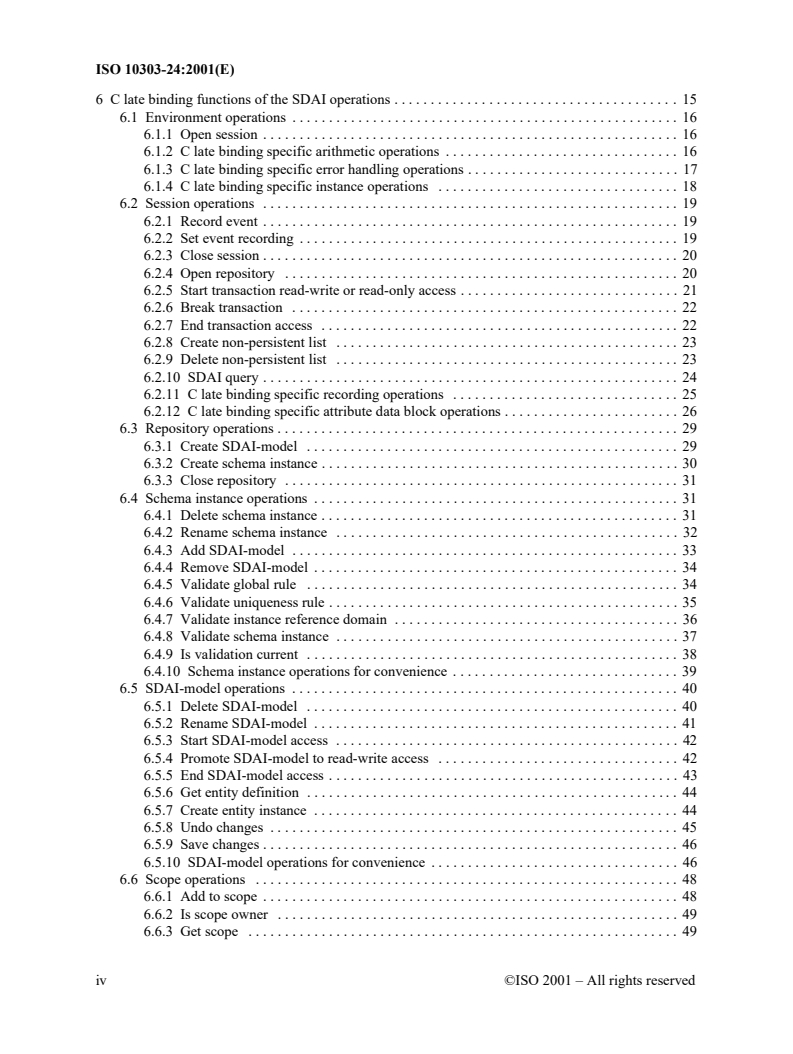 ISO 10303-24:2001 is a standard published by the International Organization for Standardization (ISO). Its full title is "Industrial automation systems and integration - Product data representation and exchange - Part 24: Implementation methods: C language binding of standard data access interface". This standard covers: This part of ISO 10303 specifies a C programming language late binding of the capability specified in ISO 10303-22 - Standard data access interface (SDAI). This binding is a late binding and as such, none of the constants, data types, and functions depend on the application schema being accessed. The following are within the scope of this part of ISO 10303: - access to and manipulation of data types and entities which are specified in ISO 10303-22; - convenience functions suitable to this language binding; - late binding requirements specified in ISO 10303-22. The following are outside the scope of this part of ISO 10303: - memory arrangement of data structures used by implementations of this part of ISO 10303; - early binding requirements as specified in ISO 10303-22; - all items listed as out of scope in ISO 10303-22.