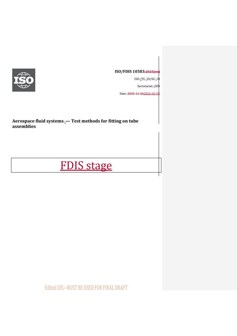 REDLINE ISO/FDIS 10583 - Aerospace fluid systems — Test methods for fitting on tube assemblies Released:2. 02. 2026