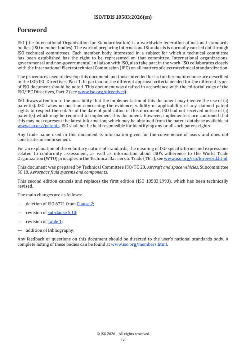 ISO/FDIS 10583 is a draft published by the International Organization for Standardization (ISO). Its full title is "Aerospace fluid systems — Test methods for fitting on tube assemblies". This standard covers: The test methods specified apply to fitting assemblies used in aircraft fluid systems in the pressure and temperature ranges covered by pressure classes B, D and E, and temperature types I, II and III of ISO 6771. Applies each time that it is referred to in a procurement specification or other definition document which contain the pass/fail criteria for these tests.
