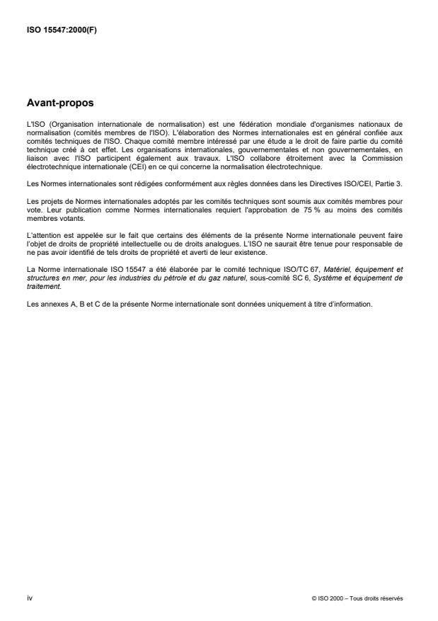 ISO 15547:2000 is a standard published by the International Organization for Standardization (ISO). Its full title is "Petroleum and natural gas industries — Plate heat exchangers". This standard covers: La présente Norme internationale définit les exigences et donne des recommandations relatives à la conception mécanique, à la sélection des matériaux, à la fabrication, au contrôle, aux essais et à la préparation pour l'expédition des échangeurs thermiques à plaques, parfois dénommés échangeurs thermiques à plaques et à bâti, destinés à être utilisés dans les industries du pétrole et du gaz naturel. La présente Norme internationale traite des échangeurs thermiques à plaques étanches, semi-soudées et soudées, délimitées par un bâti. Utilisé dans la présente Norme internationale, le terme «échangeurs thermiques» ou «échangeurs» inclut les refroidisseurs, réchauffeurs, condenseurs, évaporateurs et rebouilleurs.