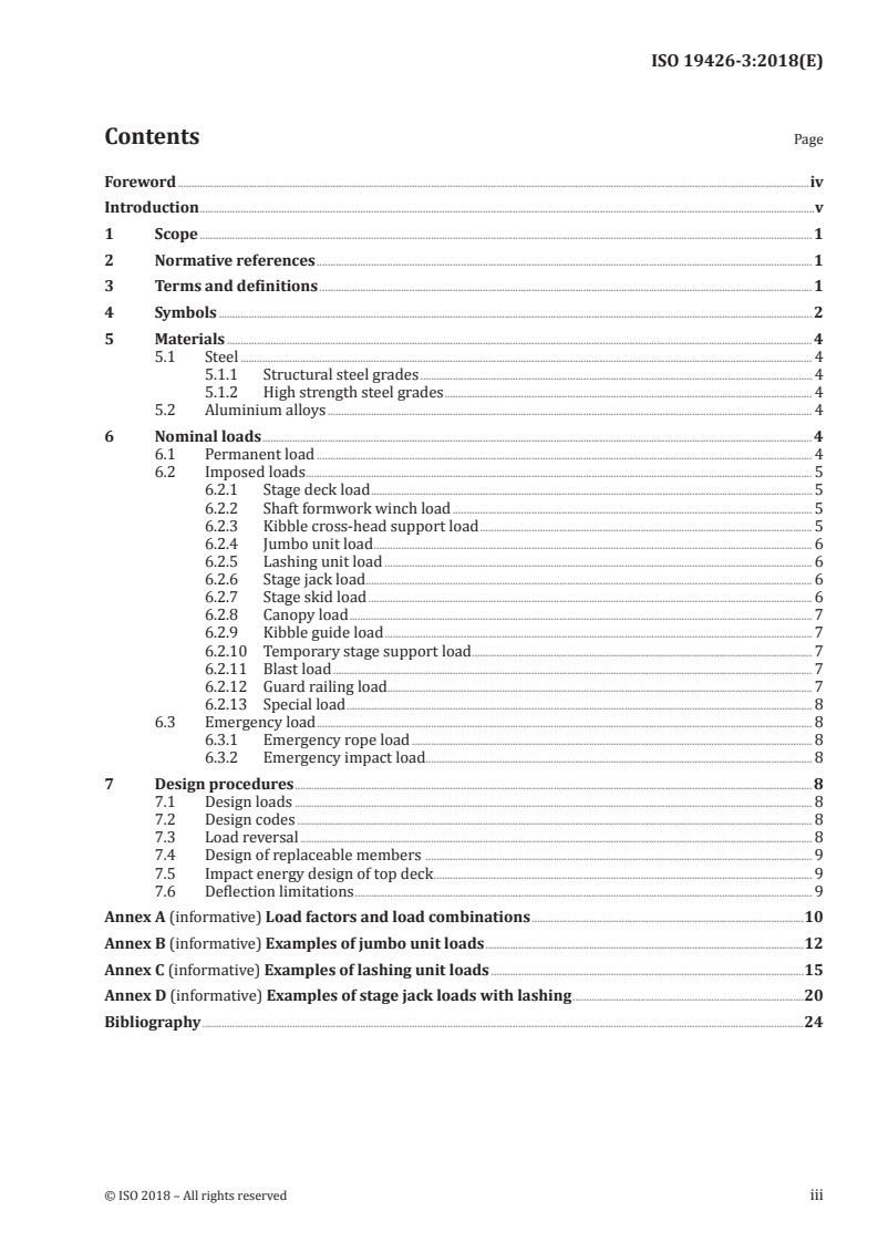 This document specifies the design loads and the design procedures for the structural design of stages and components of stages. The loads specified in this document are not applicable for the design of stage ropes or sheaves. Rope sizes are determined in accordance with other standards. This document does not cover matters of operational safety, or layout of the sinking stage. This document adopts a limit states design philosophy.