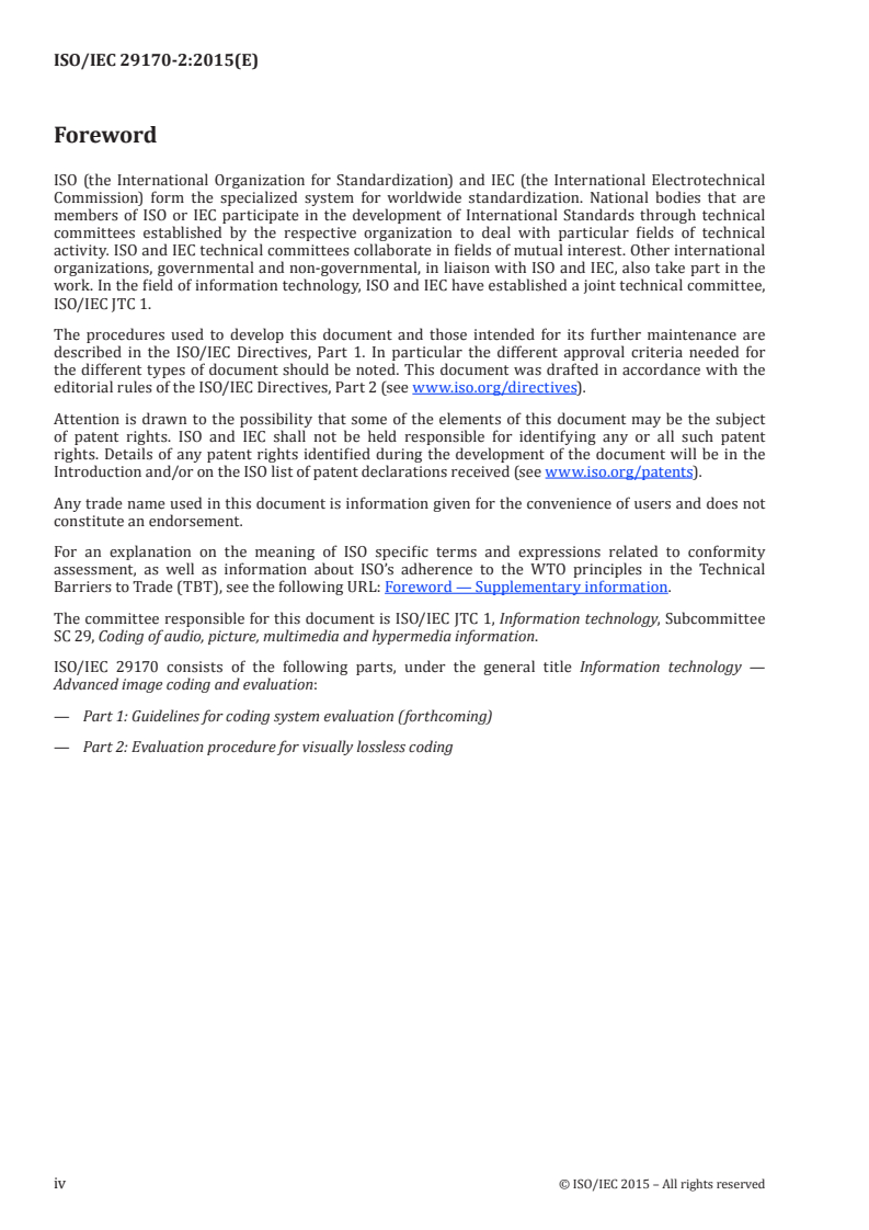 ISO/IEC 29170-2:2015 is a standard published by the International Organization for Standardization (ISO). Its full title is "Information technology — Advanced image coding and evaluation — Part 2: Evaluation procedure for nearly lossless coding". This standard covers: ISO/IEC 29170-2:2015 normalizes evaluation and grading of a light coding system used for displays and display systems, but is independent of the display technology. This procedure measures whether an observer can distinguish between an uncompressed reference and the reconstructed image to a pre-determined, statistically meaningful level. The procedure compares individual images with two possible forced choice comparison test methods. This procedure relies on subjective evaluation methods designed to discern image imperfections on electronic colour displays of any technology or size.