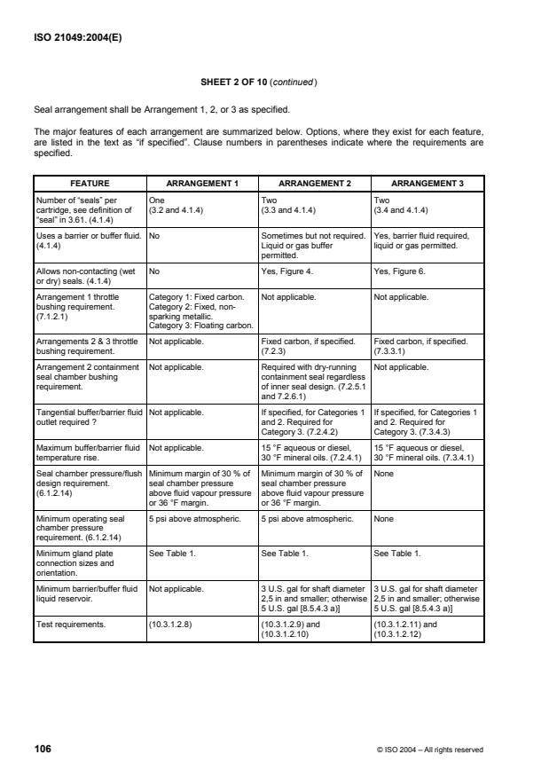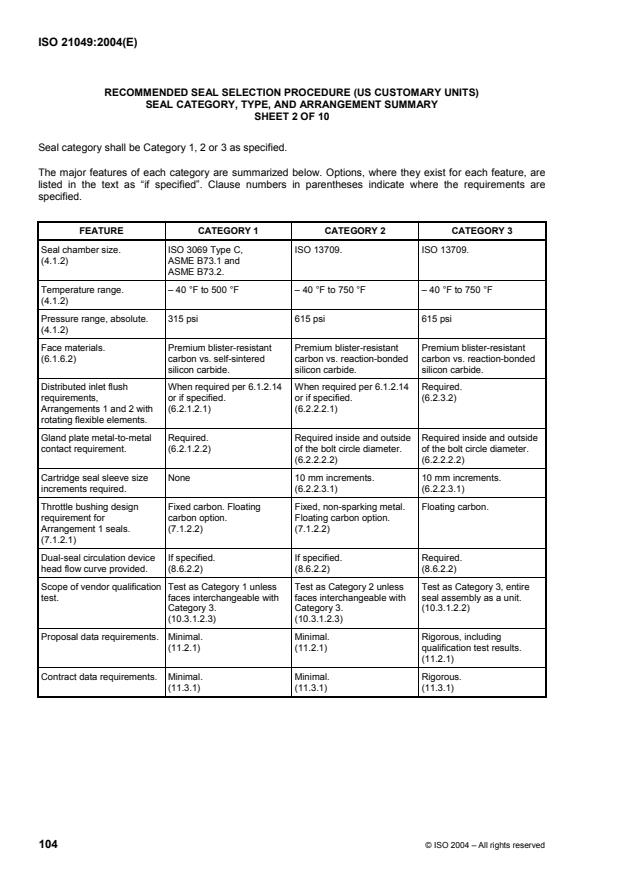 - Seal classification: Defines a systematic classification into Categories (1–3), Types (A, B, C) and Arrangements (1, 2, 3); each level carries specific selection and testing expectations.