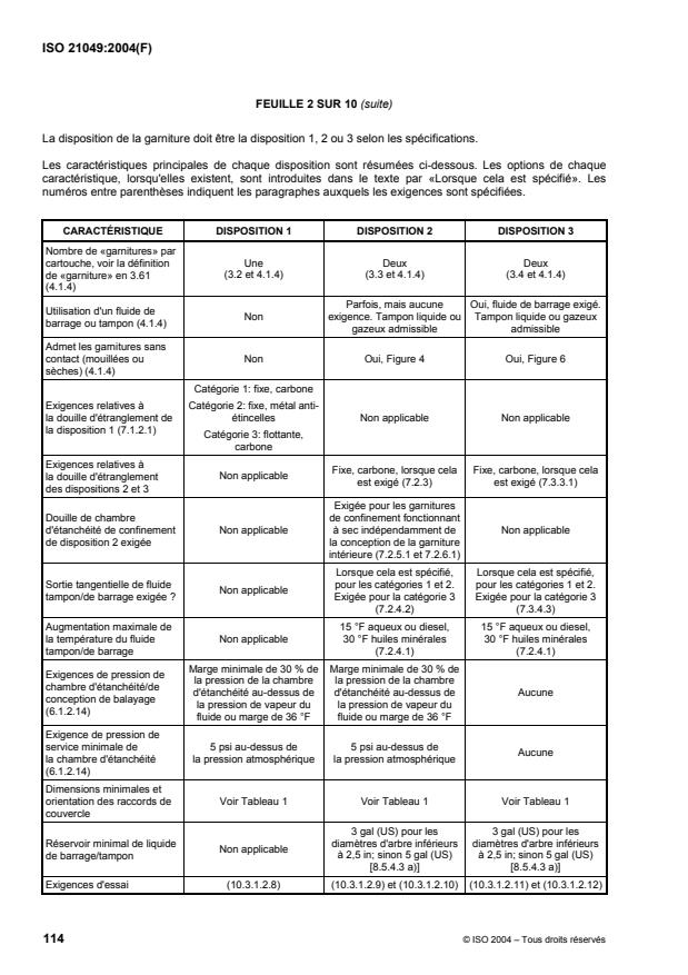 L'ISO 21049:2003 spécifie des exigences et fournit des recommandations applicables aux dispositifs d'étanchéité pour des pompes centrifuges et rotatives utilisées dans les industries du pétrole, du gaz naturel et de la chimie. Elle est applicable principalement aux services dangereux, inflammables et/ou toxiques pour lesquels un degré de fiabilité plus important est requis afin de permettre d'améliorer la disponibilité des équipements et de réduire les émissions dans l'atmosphère ainsi que le coût du cycle de vie des dispositifs d'étanchéité. Elle couvre des dispositifs d'étanchéité pour des diamètres d'arbre compris entre 20 mm (0,75 in) et 110 mm (4,3 in). L'ISO 21049:2003 est applicable également aux pièces de rechange des dispositifs d'étanchéité et peut être citée en tant que référence normative dans le cadre de rénovations d'équipements existants. Un système de classification est fourni, permettant de classer en catégories, types et dispositions les configurations des garnitures couvertes par l'ISO 21049:2003.