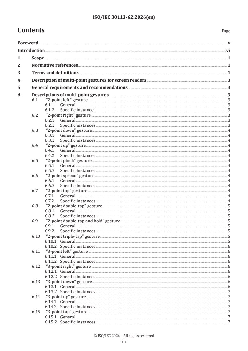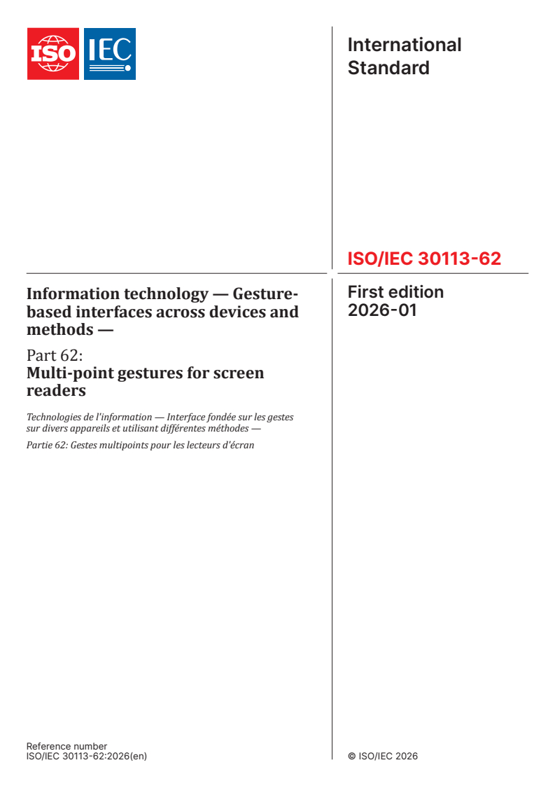 ISO/IEC 30113-62:2026 is a standard published by the International Organization for Standardization (ISO). Its full title is "Information technology — Gesture-based interfaces across devices and methods — Part 62: Multi-point gestures for screen readers". This standard covers: This document defines multi-point gestures for screen readers. It specifies movements for clear and classified multi-point gestures recognized by the screen readers. It describes multi-point gestures performed by multiple point of interest (POI) for the screen readers. NOTE Multiple POI can be manipulated by using multiple objects such as fingertips, etc.