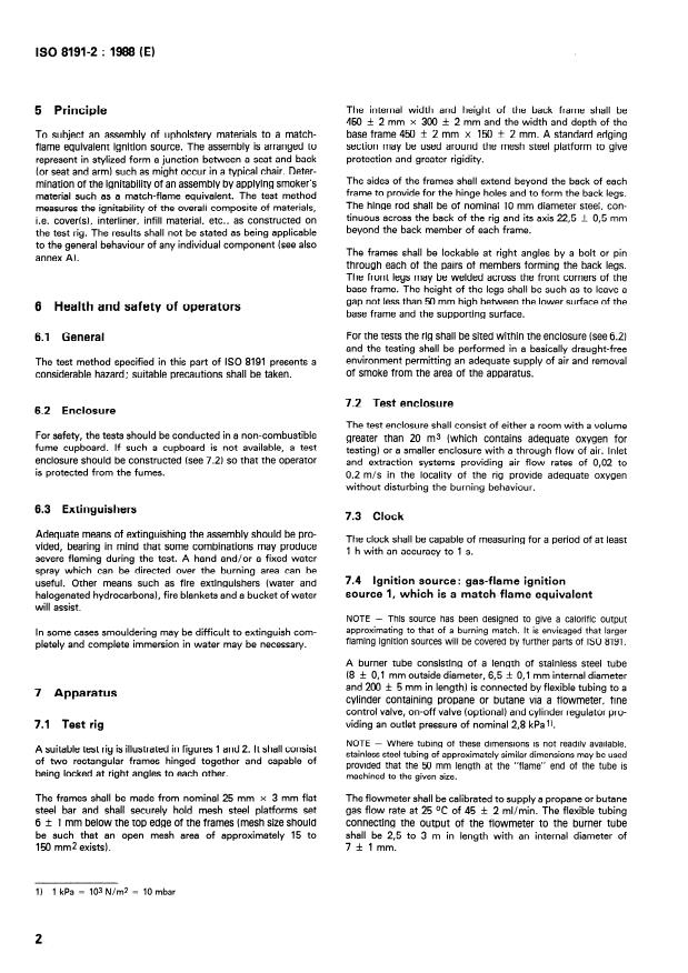 ISO 8191-2:1988 is a standard published by the International Organization for Standardization (ISO). Its full title is "Furniture - Assessment of ignitability of upholstered furniture - Part 2: Ignition source: match-flame equivalent". This standard covers: Belongs to a series of standards concerned with the major subject. The three annexes do not form integral parts of ISO 8191-2. The test methods are intended for a combination of materials used such as covers and fillings in uphlostered seating, and not for a particular finished item of furniture incorporating these materials. They only give an indication of, but cannot guarantee, the ignition behaviour of the finished item of furniture.