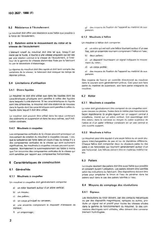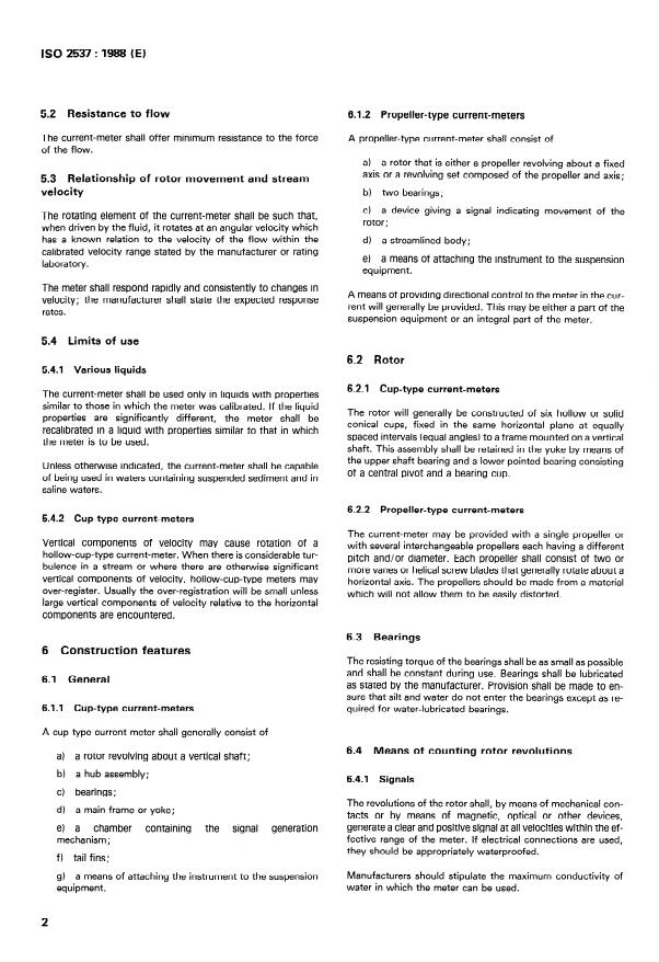 ISO 2537:1988 is a standard published by the International Organization for Standardization (ISO). Its full title is "Liquid flow measurement in open channels — Rotating element current-meters". This standard covers: Specifies the operational requirements, construction, calibration, and maintenance of rotating element devices for the measurement of flow velocities in open channels. Does not define the form of the signal produced by the equipment or the signal receiving equipment. Cancels and replaces the second edition (ISO 2537 : 1985), of which it constitutes a technical revision.