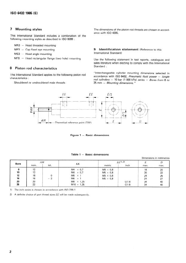 ISO 6432:1985 is a standard published by the International Organization for Standardization (ISO). Its full title is "Pneumatic fluid power — Single rod cylinders — 10 bar (1 000 kPa) series — Bores from 8 to 25 mm — Mounting dimensions". This standard covers: Establishes metric mounting dimensions for cylinders as required for interchangeability of commonly used hydraulic cylinders. Includes the bore sizes as follows: 8, 10, 12, 16, 20, 25 mm. Gives the following mounting styles: MR3, MP3, MS3, MF8 (tables 2 and 3, figures 2 and 3). Figure 1 and table 1 contain the basic dimensions.