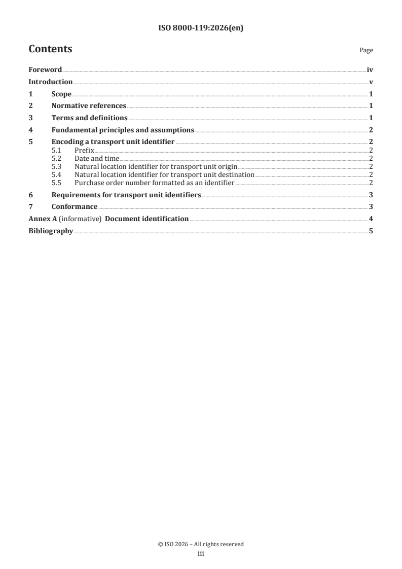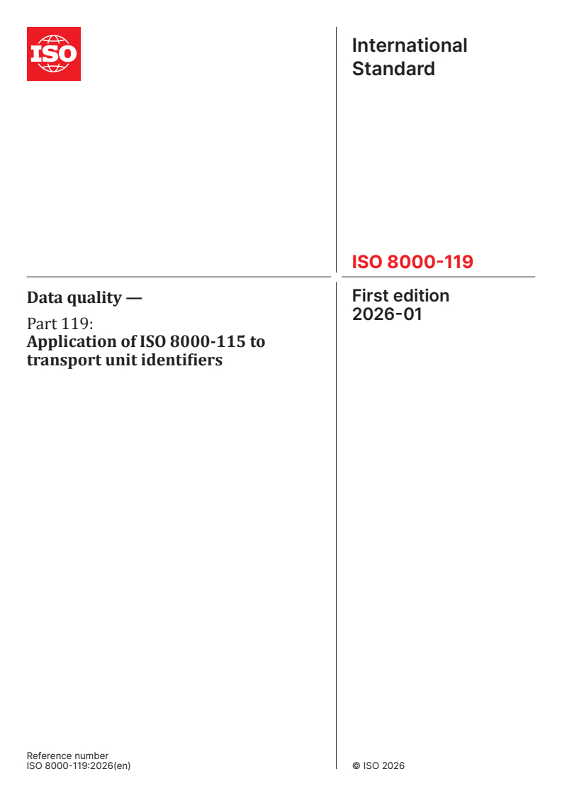 ISO 8000-119:2026 is a standard published by the International Organization for Standardization (ISO). Its full title is "Data quality — Part 119: Application of ISO 8000-115 to transport unit identifiers". This standard covers: This document specifies the requirements for transport unit identifiers (TUID). These requirements supplement those of ISO 8000-115. The following are within the scope of this document: — the methods used to identify the originator of a potential shipment; — the methods used to identify the origin and destination locations of a potential shipment; — the requirements for the representation of the originator, origin, and destination locations of a potential shipment in a single identifier. The following are outside the scope of this document: — the methods used to identify shipments in the transport phase; — the identification of the goods movement phase.