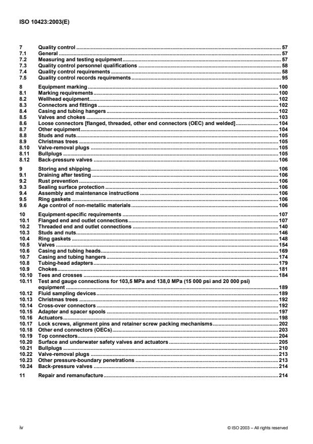ISO 10423:2003 specifies requirements and gives recommendations for the performance, dimensional and functional interchangeability, design, materials, testing, inspection, welding, marking, handling, storing, shipment, purchasing, repair and remanufacture of wellhead and christmas tree equipment for use in the petroleum and natural gas industries. ISO 10423:2003 does not apply to field use, field testing or field repair of wellhead and christmas tree equipment. ISO 10423:2003 is applicable to wellhead equipment (casing head housings, casing head spools, tubing head spools, cross-over spools, multi-stage head housings and spools), connectors and fittings (cross-over connectors, tubing head adapters, top connectors, tees and crosses, fluid-sampling devices, adapter and spacer spools), casing and tubing hangers (mandrel hangers, slip hangers), valves and chokes (single valves, multiple valves, actuated valves, valves prepared for actuators, check valves, chokes, surface and underwater safety valves and actuators, back-pressure valves), loose connectors [flanged, threaded, other end connectors (oec), and welded] (weld neck connectors, blind connectors, threaded connectors, adapter and spacer connectors, bullplugs, valve-removal plugs), other equipment (actuators, hubs, pressure boundary penetrations, ring gaskets, running and testing tools, wear bushings). ISO 10423:2003 defines service conditions, in terms of pressure, temperature and material class for the well-bore constituents, and operating conditions. ISO 10423:2003 establishes requirements for five product specification levels (PSL). These five PSL designations define different levels of technical quality requirements. It also provides guidelines (not requirements) for selecting an acceptable PSL.
