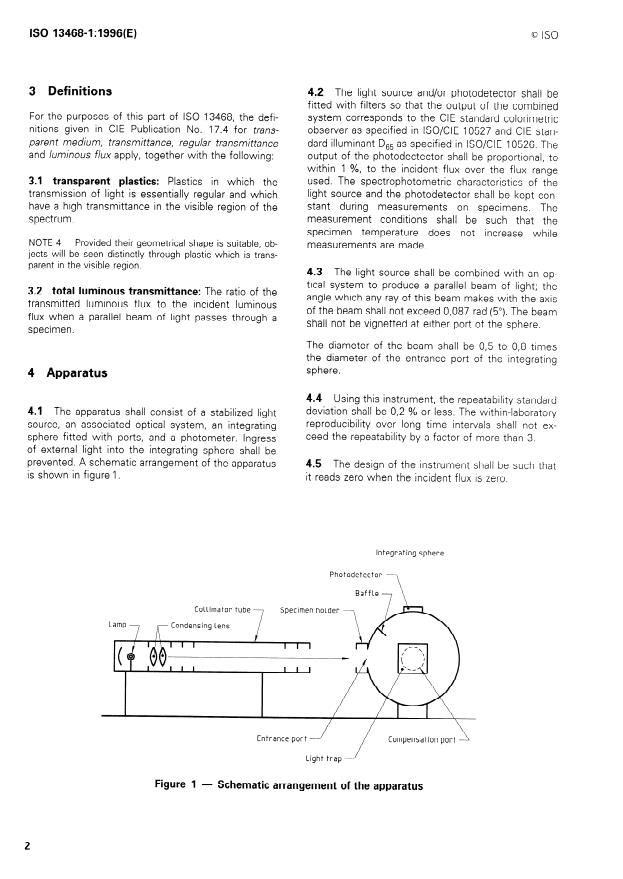ISO 13468-1:1996 is a standard published by the International Organization for Standardization (ISO). Its full title is "Plastics — Determination of the total luminous transmittance of transparent materials — Part 1: Single-beam instrument". This standard covers: Deals with the determination of the total luminous transmittance, in the visible region of the spectrum, of planar transparent and substantially colourless plastics, using a single-beam photometer with a specified CIE standard light source and photodetector. Does not apply to plastics which contain fluorescent substances.